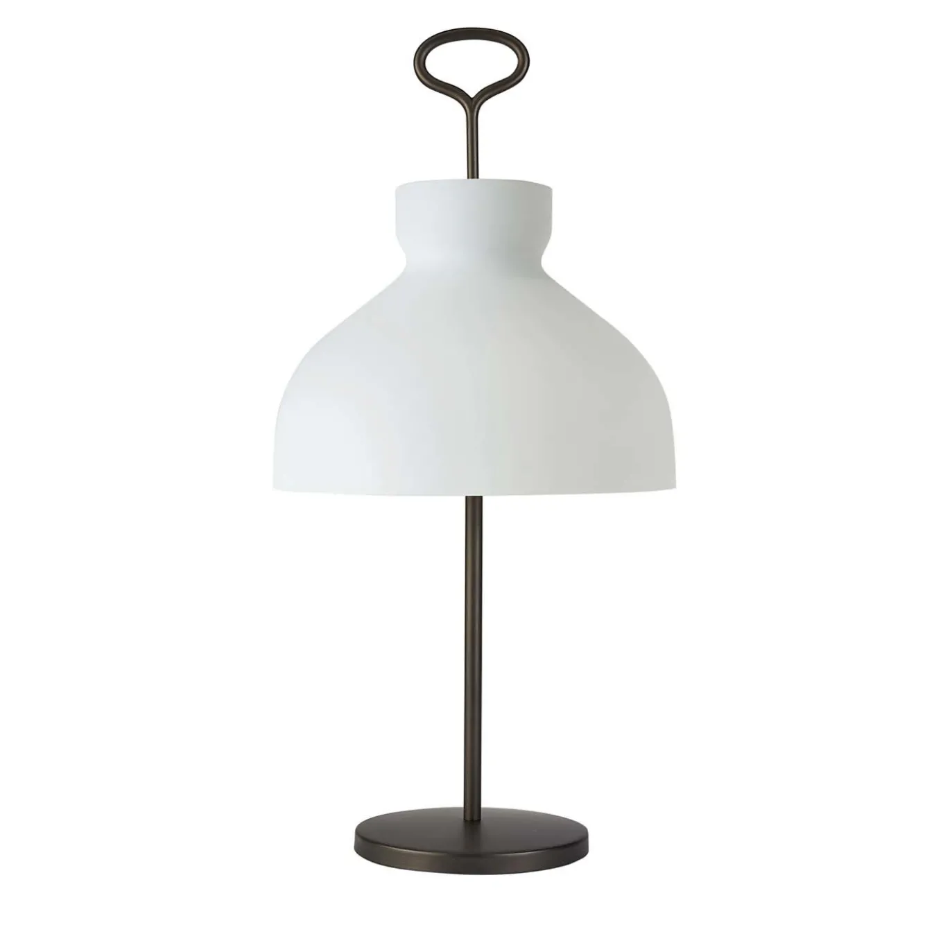 Designed by Ignazio Gardella in 1956, the Arenzano Table Lamp comes from a complete collection of lighting solutions. On an essential brass base with a satin bronze finish, the lamp is accented with a small top loop and completed with a white glass shade. Bulbs: 3 x LED max 5W E14-220V or E12-110V.