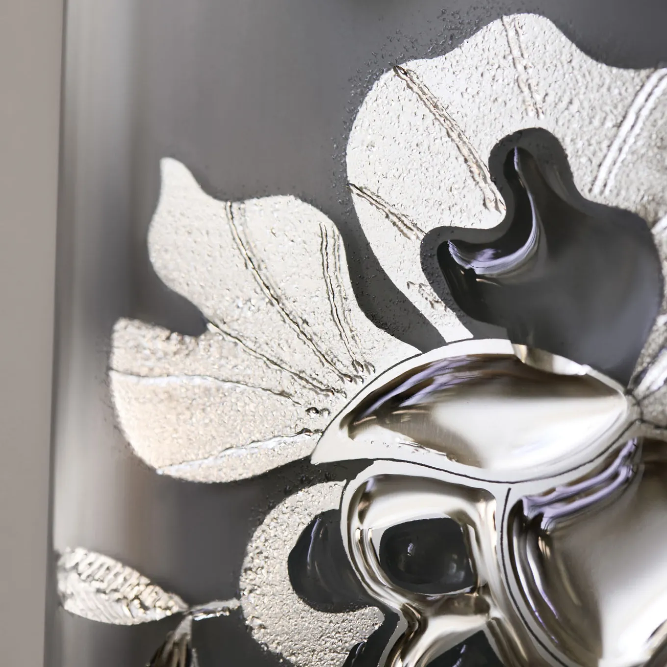 Arielle wall mirror features a grand, botanical-inspired border with intricate floral details that offer a delicate, embroidered portrait frame effect. This statement piece commands space with elegance, showcasing artisanal craftsmanship with subtle variations that highlight its unique and unrepeatable character, adding refined charm to any interior setting.