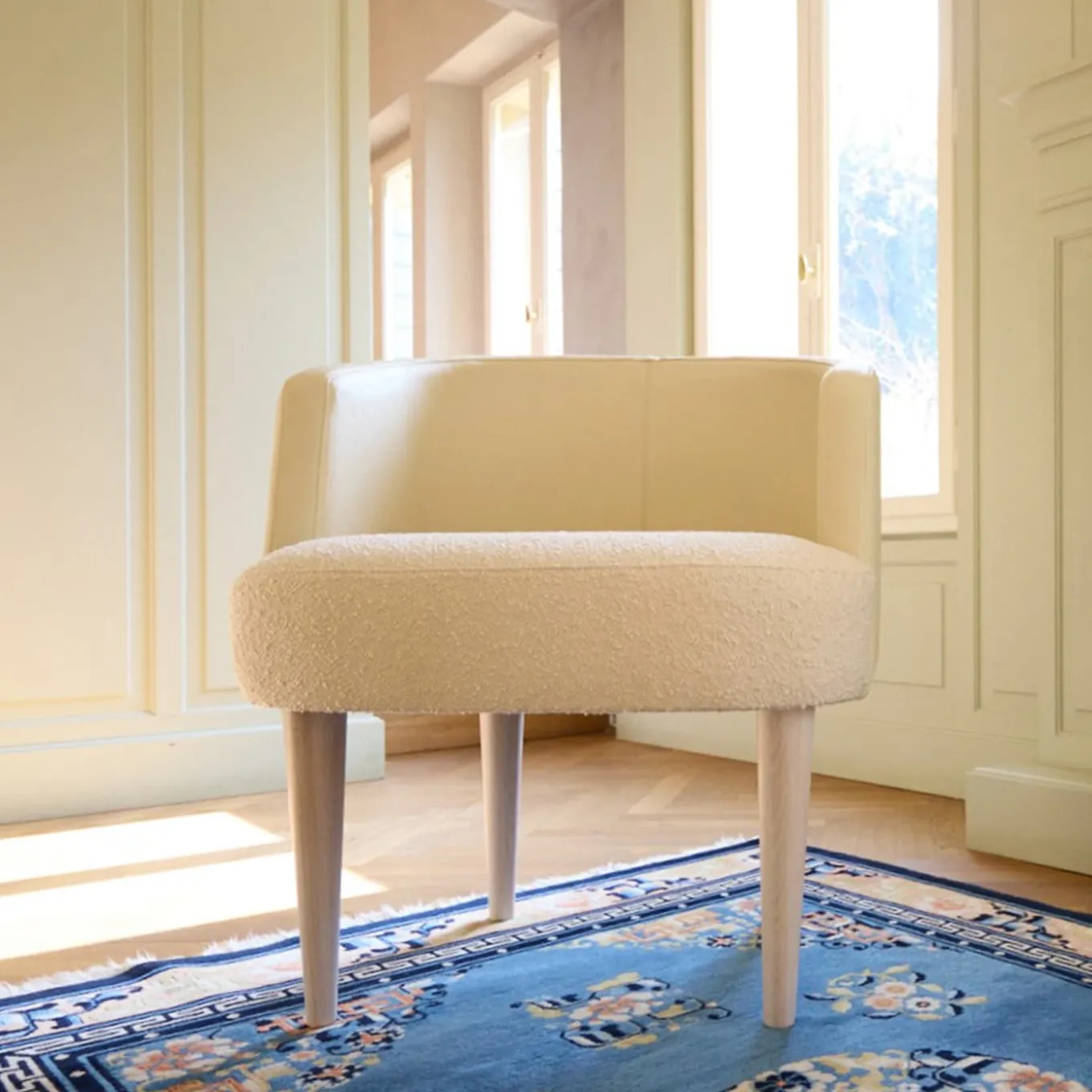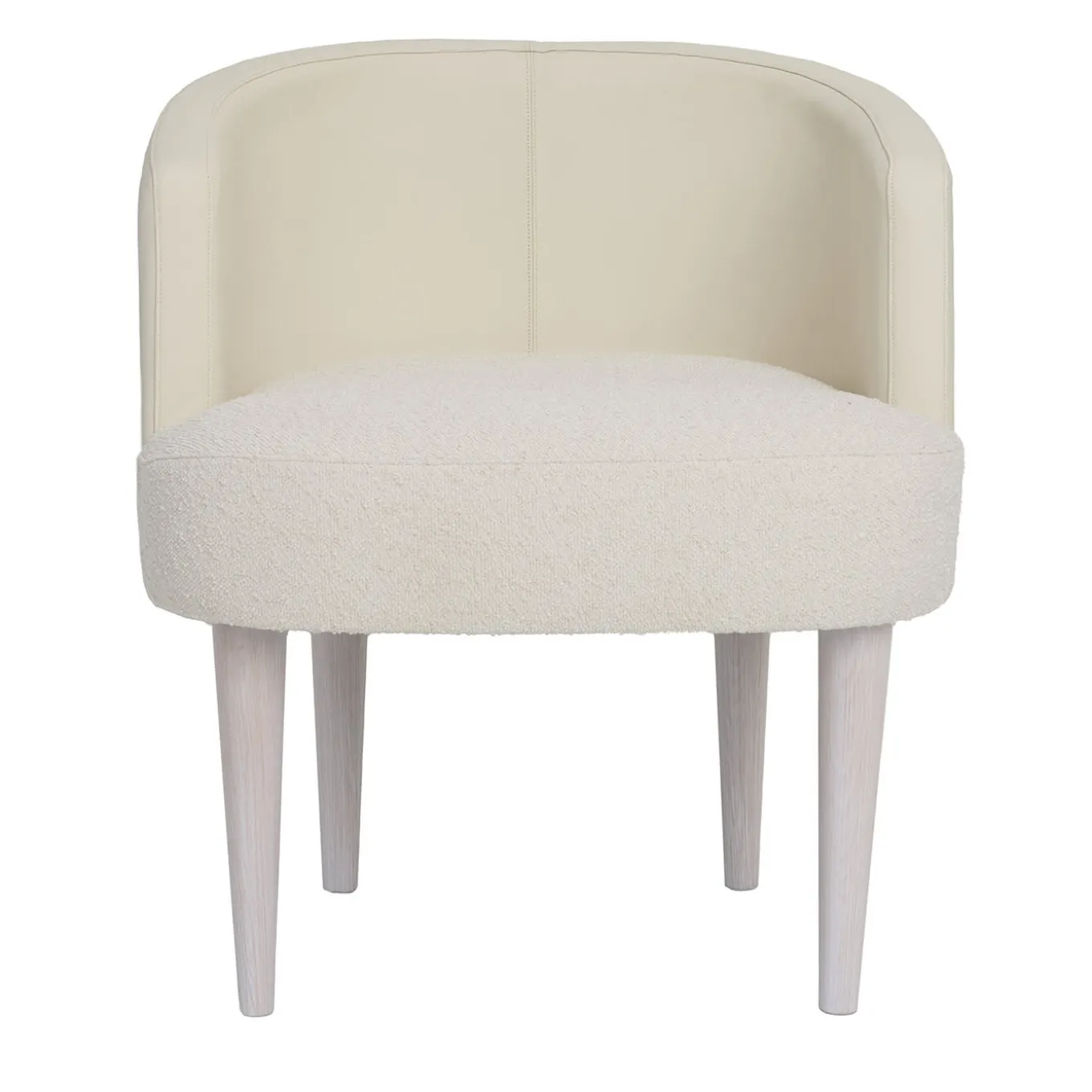 Clean and enveloping lines trace the harmonious silhouette of this armchair, a luminous addition to modern dining rooms or private studies. Deftly upholstered by hand in authentic Top Grain Real Piel RP® white leather, the fully-embracing backrest – with armrests naturally incorporated within its sloped profiles – maximizes the level of comfort already provided by the plump Dedar Lupo fabric-covered seat. Tapered color-coordinated legs complete the design.