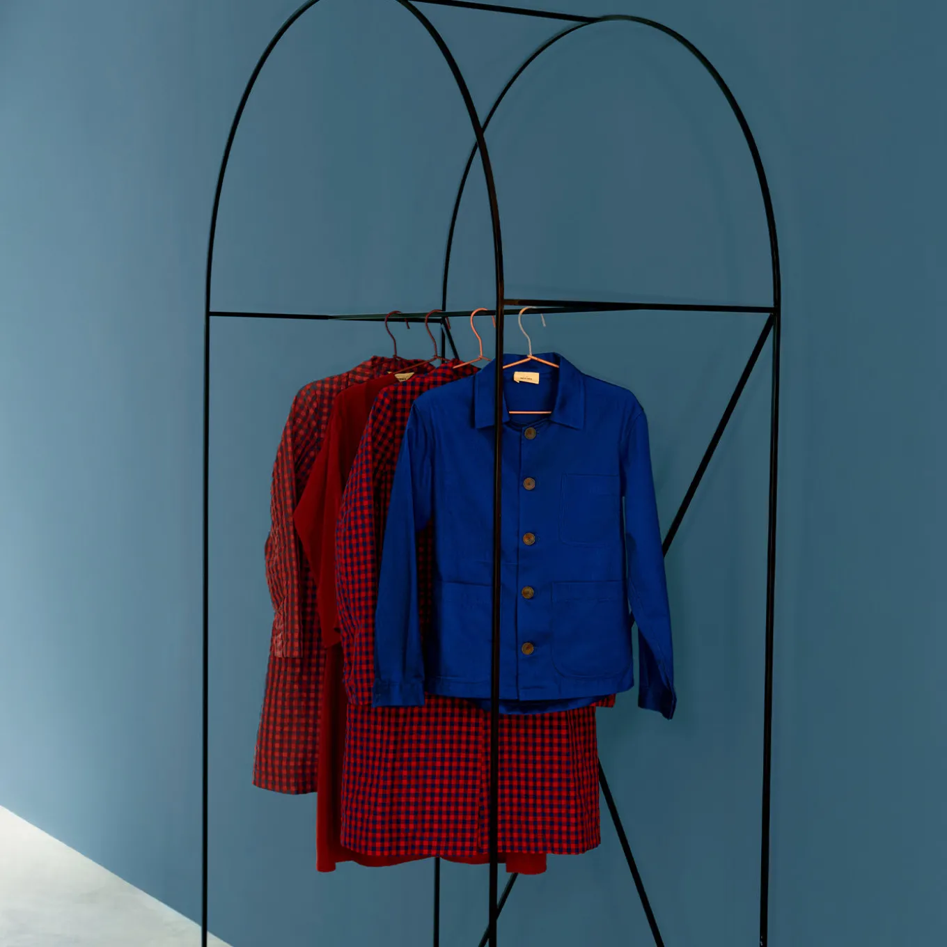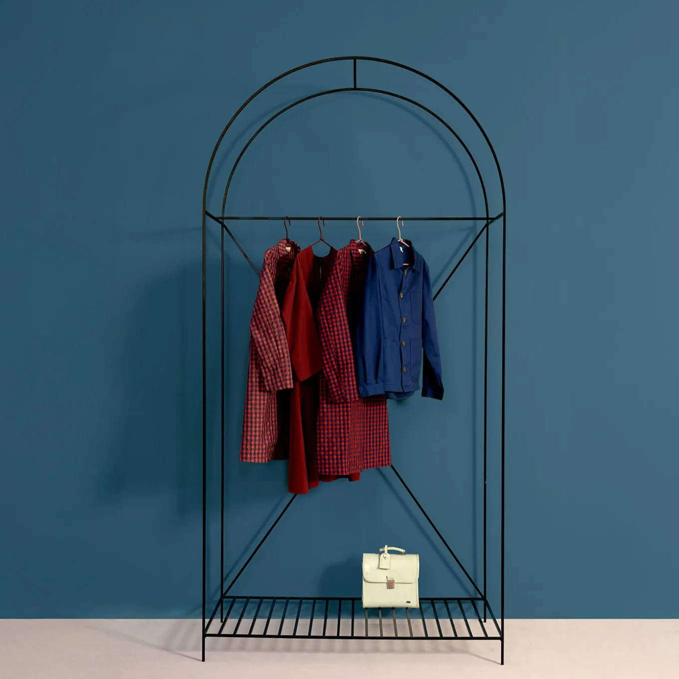 This clothes rack, a refined contemporary design artfully reinventing traditional furniture, is characterized by a sort of phantom volume where only the skeleton of a wardrobe is maintained. Its structure, consisting of welded iron rods, simultaneously delivers a sense of airiness and sturdiness. The arched top emphasizes harmony, softening the otherwise rigorous compositions. Ella hangers ideally complement the design.