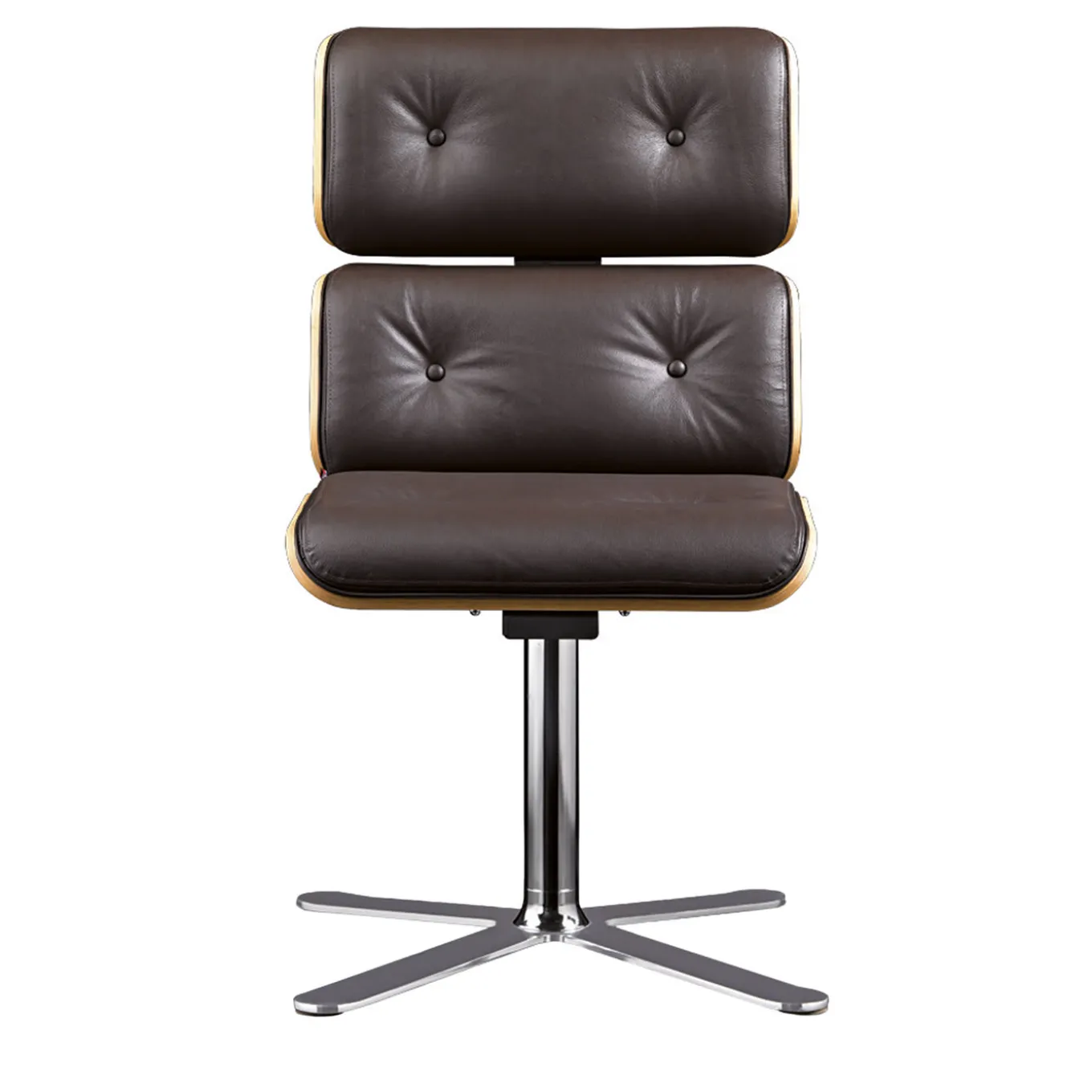 Intrinsically modern, this sleek and elegant office chair is the epitome of comfort. This exclusive design by Rainer Bachshmid features two curved elements on the back and a larger one for the seat made of beech plywood veneer with Canaletto walnut finish, each padded and upholstered in premium dark brown Italian leather. The 4-star chromed steel base is equipped with a seat return mechanism. The Armadillo Collection is available in two versions (with and without armrests) and high back lounge style, please contact the Concierge for details.