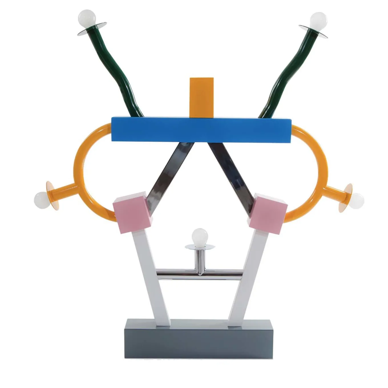 A superb object of functional decor that will not go unnoticed on a large console or spacious side table, this stunning lamp was designed in 1981 by Ettore Sottsass and crafted of lacquered metal. Its imposing size, colorful elements, and dynamic, symmetrical silhouette create a one-of-a-kind sculptural piece that will illuminate a room with its five bulbs. It is possible to add a 110V system to this lamp, please consult the Concierge before ordering.