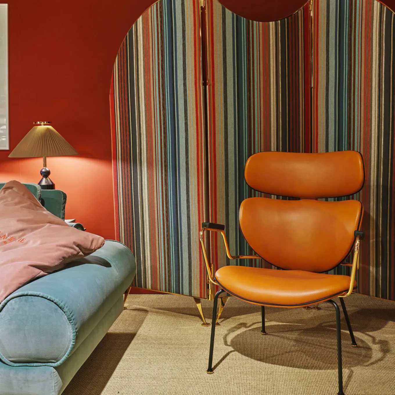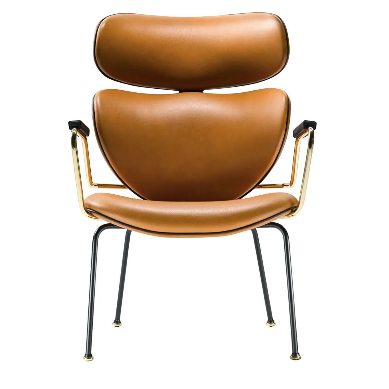 Elegant and modern, this chair is a superb addition to a modern study or stylish office space. Its comfortable structure rests on a base of tubular metal with a matte black lacquer, and polished gold-finished metal ferrules. The welcoming seat, back, and headrests have a beech plywood frame covered with highly resistant polyurethane foam. The stainless steel armrests have a gold finish. The non-removable cover is fashioned of leather in a rich light-brown color. Contract and commercial certifications available upon request.