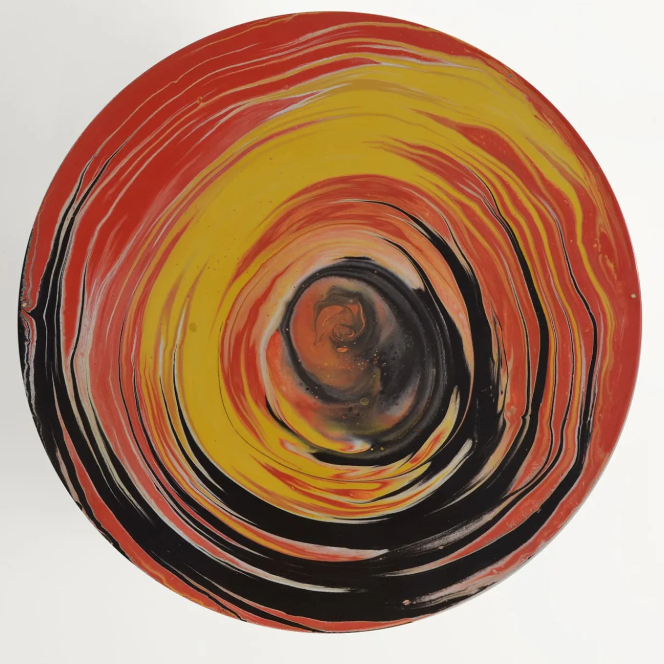 An authentic objet d’art crafted and decorated by hand, this coffee table belongs to the poetic Astraliti series inspired by the contemplation of the universe. A vortex where vibrant warm shades combine with white and black tones lends the Fenix top its hypnotizing look, while a lively, red-dappled motif accents the bold concrete base connected to the top by the contrasting glossy-black metal rod.