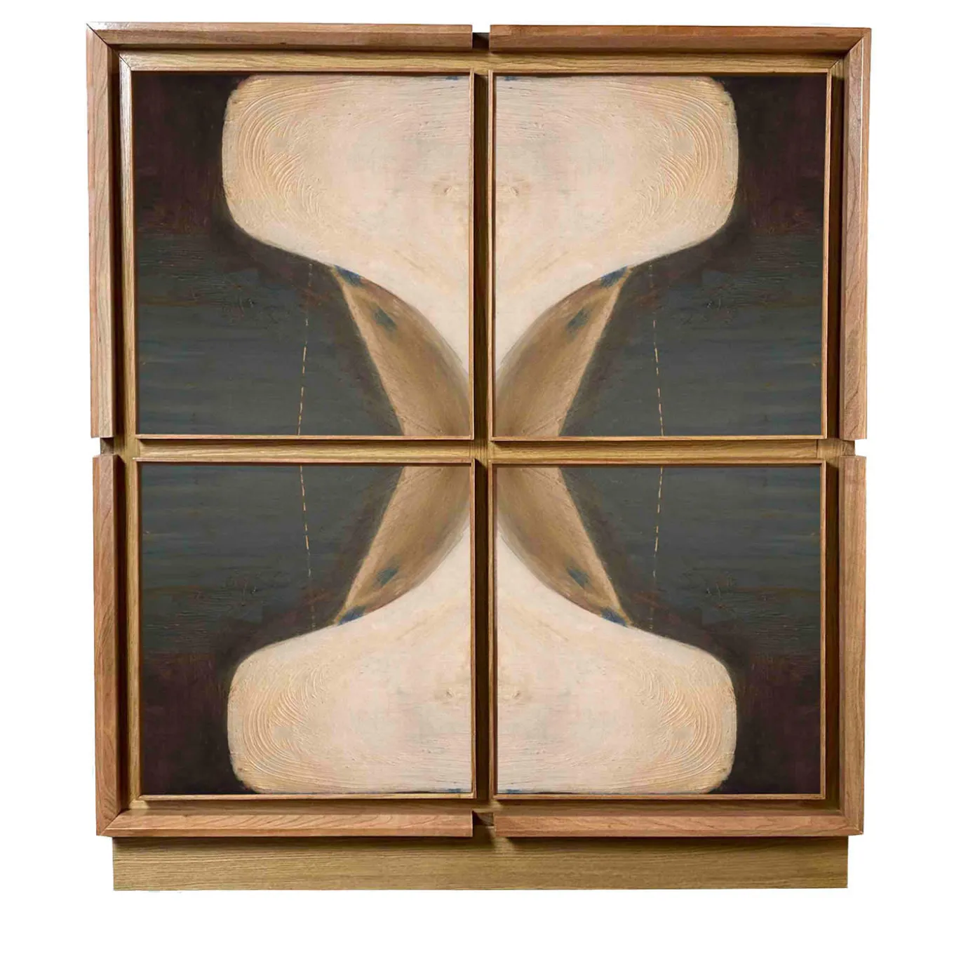 The Astratta Tre cabinet by Mascia Meccani is a singular design that merges art and craftsmanship into a striking handmade piece. Part of a limited edition of 10 numbered designs created in 2022, it is painted by hand with an abstract decoration that draws inspiration from Ferdinando Meccani’s oil paintings from the ’60s and ’70s. Handcrafted of durmast finished in cherry and walnut, it is customizable in wood essence and size upon request to the Concierge.