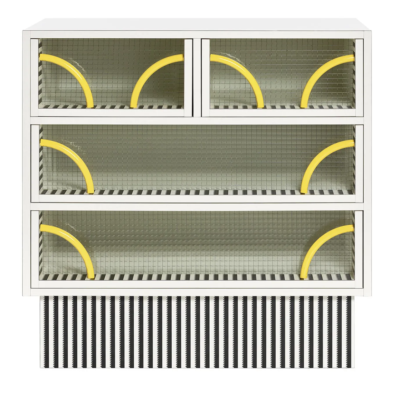 Splendidly encompassing the guidelines of Memphis aesthetic, this striking chest of drawers was designed in 1981 by Michele De Lucchi. It is crafted of plastic laminate, metal, and glass and comprises a plinth base on which two large and two small open compartments create a versatile display space. The black and white color combination is strikingly adorned with round element seemingly running through the structure adding a dash of vivid yellow color. This piece is available with 90 cm or 120 cm width. Please ask the Concierge for details.