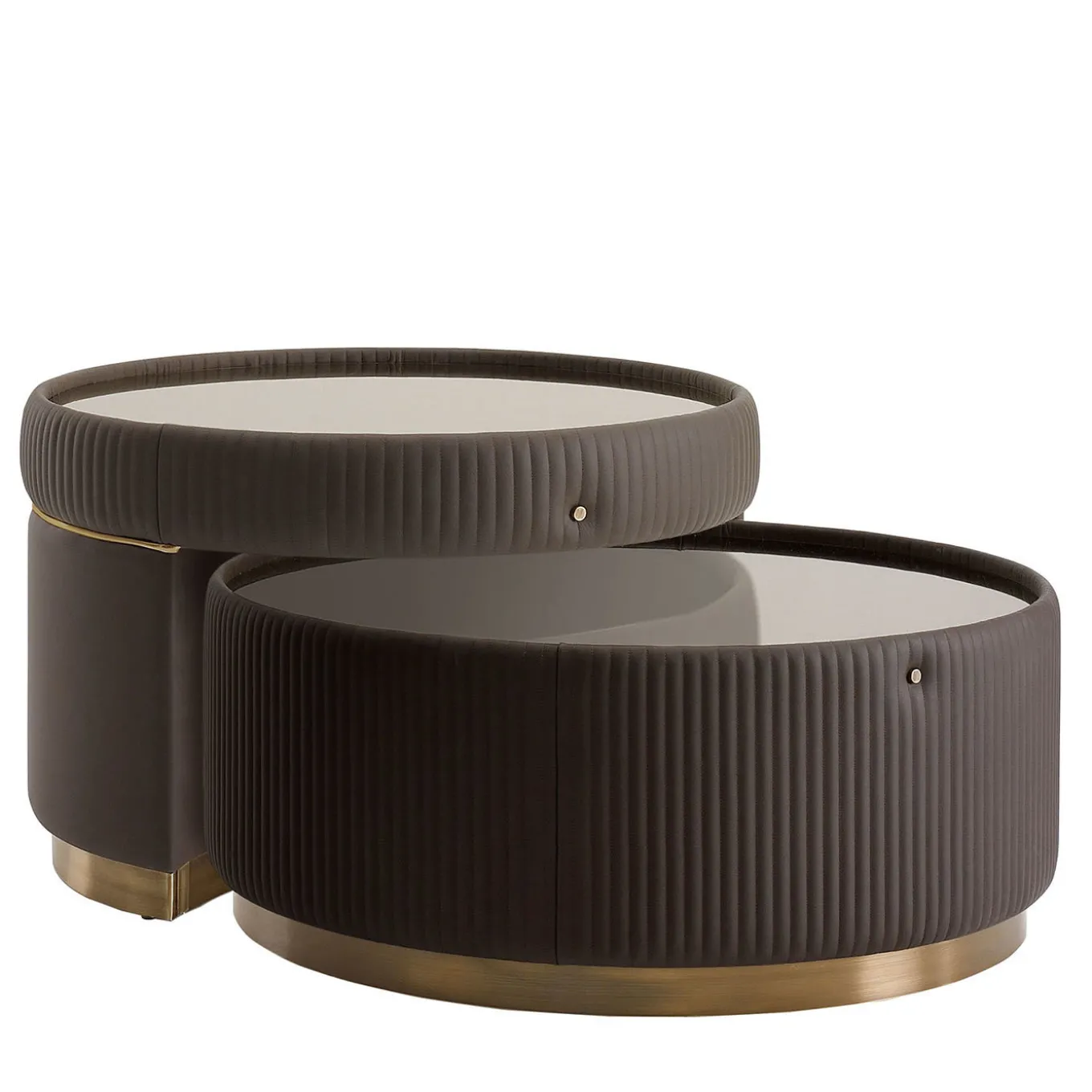 Careful details, such as a recessed glass tabletop ringed with dark brown cannette leather, bring a dynamic flair to this undeniably alluring, architectural design featuring a curved plywood frame raised on a chrome-plated stainless steel plinth. The Augusta Coffee Table features two nesting round shapes (Ø102 x H41cm and Ø82 x H53cm), that will take center stage in a sophisticated living room or lounge area. Top is also available in natural or lacquered wood upon request.