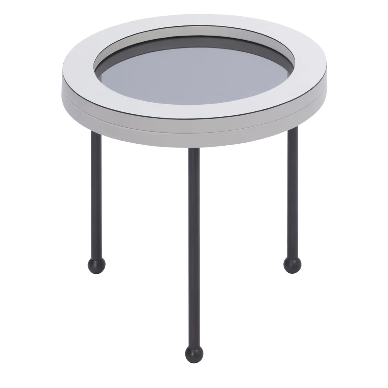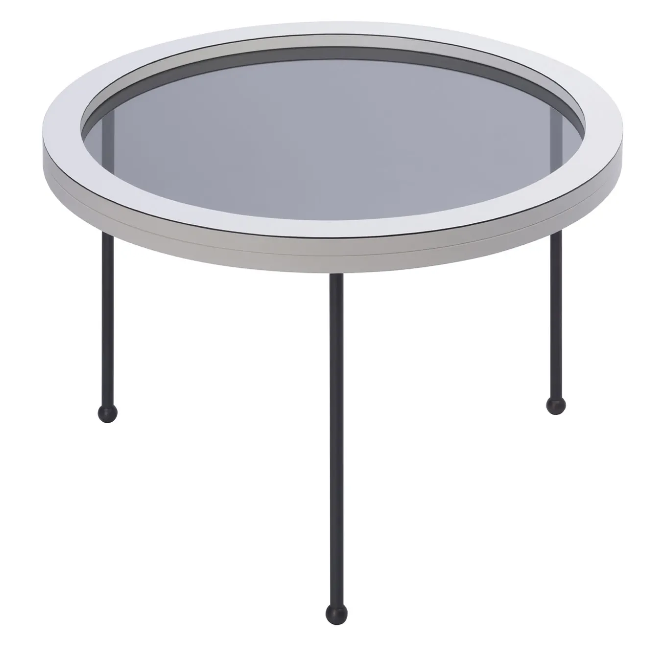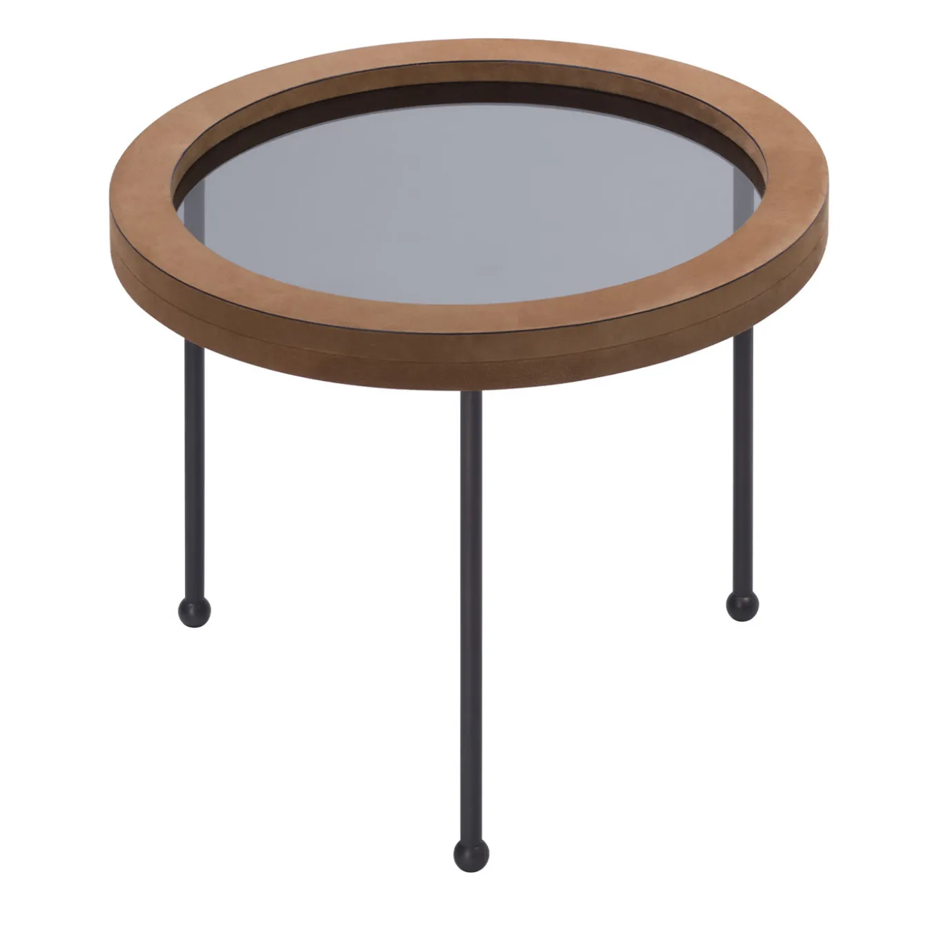 Part of the Augustus Collection inspired by the famous 1950 Italian ocean liner’s portholes, this set of three nesting tables features a smoky glass top framed by a thick leather border supported by three bronze legs with spherical ferrules. The tables measure (in cm): Ø 35 x H 35.5, Ø 49.5 x H 41.5, Ø 66 x H 48. Leather is available in nappa, suede, and printed calfskin.