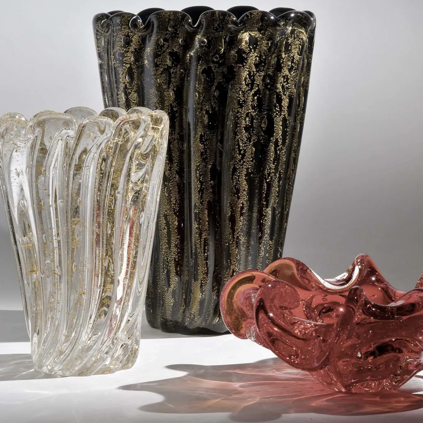 A superb expression of Italian art and Murano glassmaking tradition, this ashtray is distinguished for its bold colors and dynamic allure. The classic geometric ashtray silhouette is reimagined with a sinuously shaped mouth and dramatic lines. The flecks of gold foil embedded in the glass interplay with the red glass, enhancing the texture and shape of the glass. Best showcased on a console, sideboard, or side table in a living room or private study.