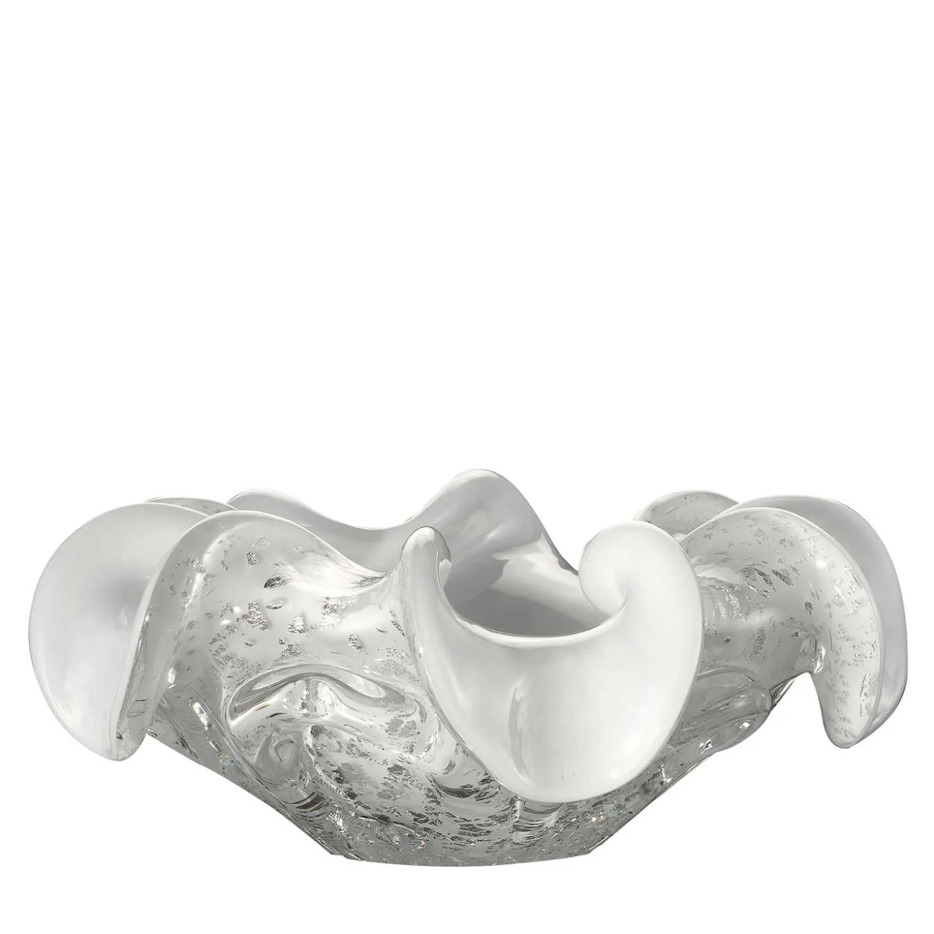 Showcased as a centerpiece in an entryway or set on a living room coffee table, this exceptional Murano glass ashtray will be the focal point of any living room or study decor. The bi-colored glass silhouette, distinguished for the white interior and the clear exterior with silver foil, boasts a dramatically shaped silhouette with a sinuous mouth and tapered base. The rich colors and relief details create a dynamic textural contrast that adds visual harmony to the piece.
