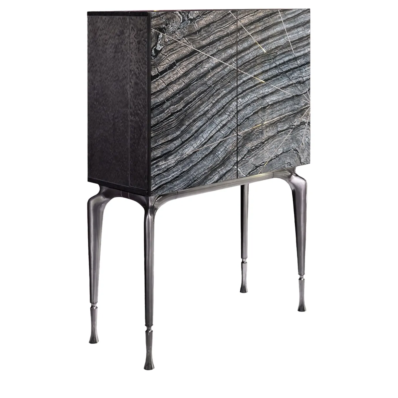 The Aurora bar cabinet features a glossy jet-black lacquered structure with textured natural stone doors and polished metal inlays. Inside, extra-clear glass shelves and a smoked mirrored back panel add elegance, complemented by jet-black lacquered finishes. Steel legs with a satin black nickel finish and an enameled jet-black knob plate complete the design. A luxurious blend of stone, metal, and glass ensures style and durability.