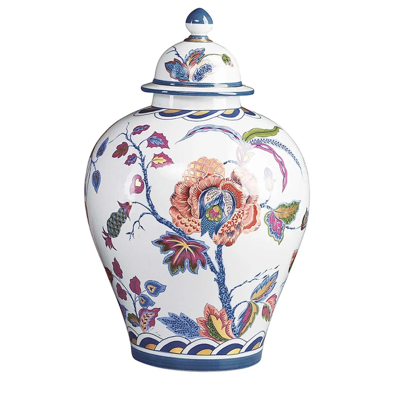 Recognizable for the flattering floral motif inspired by fall (“autunno” in Italian) nuances of burgundy and orange, this exquisite porcelain potiche is imbued with a precious, artistic allure. Its sinuous and luminous design is complete with a dome lid enlivened by an ornate spherical finial.