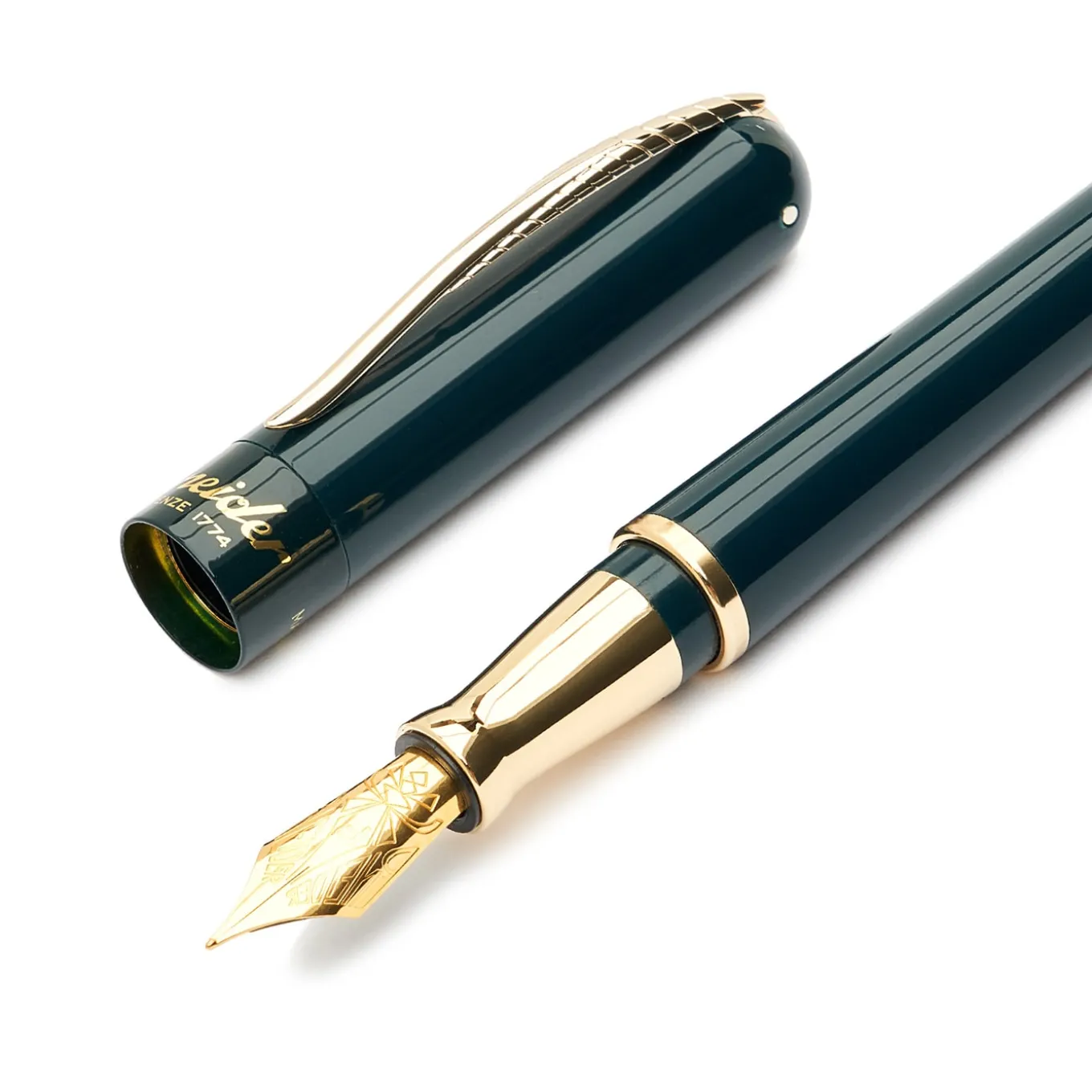 This fountain pen stands out with its rich green lacquer finish, exuding timeless sophistication. The polished gold trims enhance its classic appeal, while the medium nib ensures smooth, consistent ink flow for refined writing. Its well-balanced structure offers precision and comfort, making it ideal for formal correspondence, journaling, or treasured gifts. A harmonious blend of style and performance, this pen elevates every writing moment with poise.