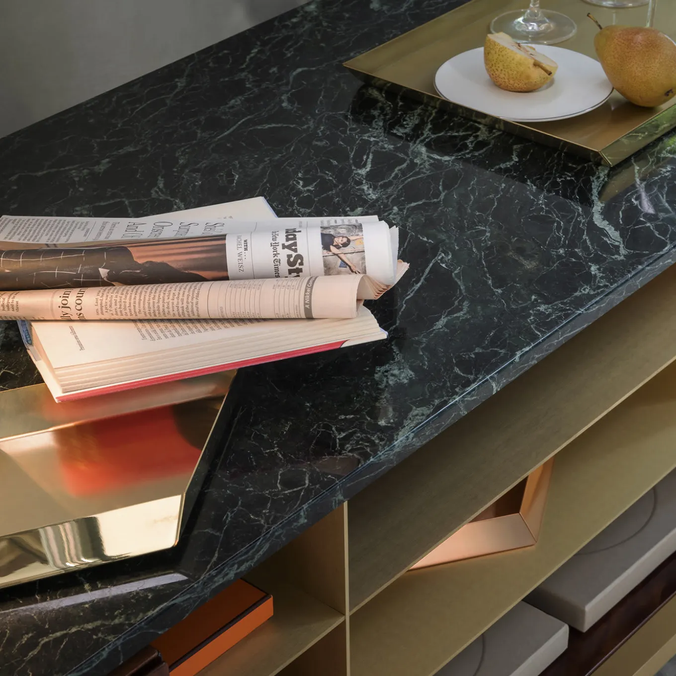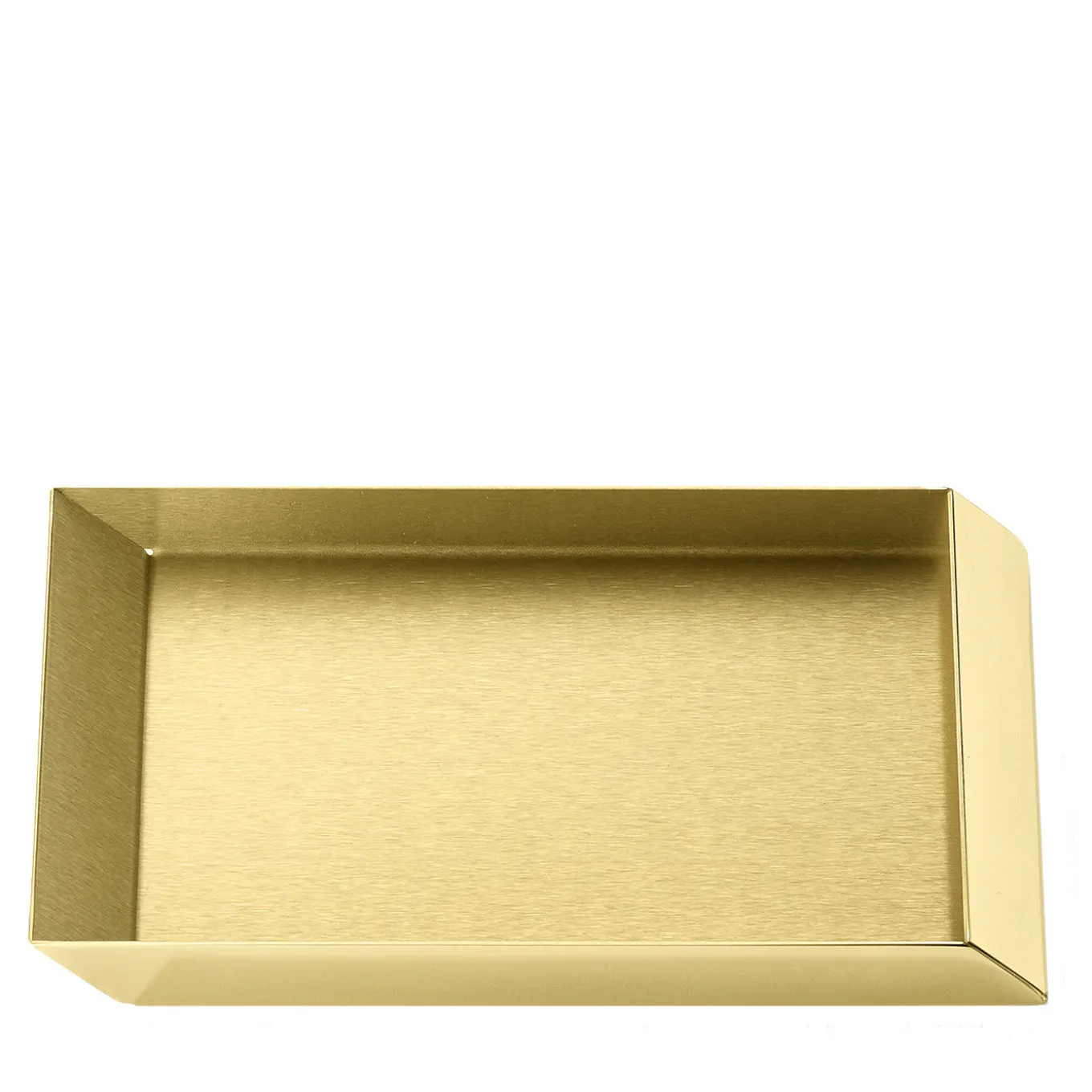 This exquisite tray will be a mesmerizing addition to a modern, minimalist table or console. Seemingly off-kilter, the brass’ contrasting metal finishes and inclined edges create a distinctive optical illusion. A vessel to hold candles, fresh potpourri, and priceless personal objects in an entryway or bedroom dresser, this tray will be a show-stopping addition to any home decor collection.