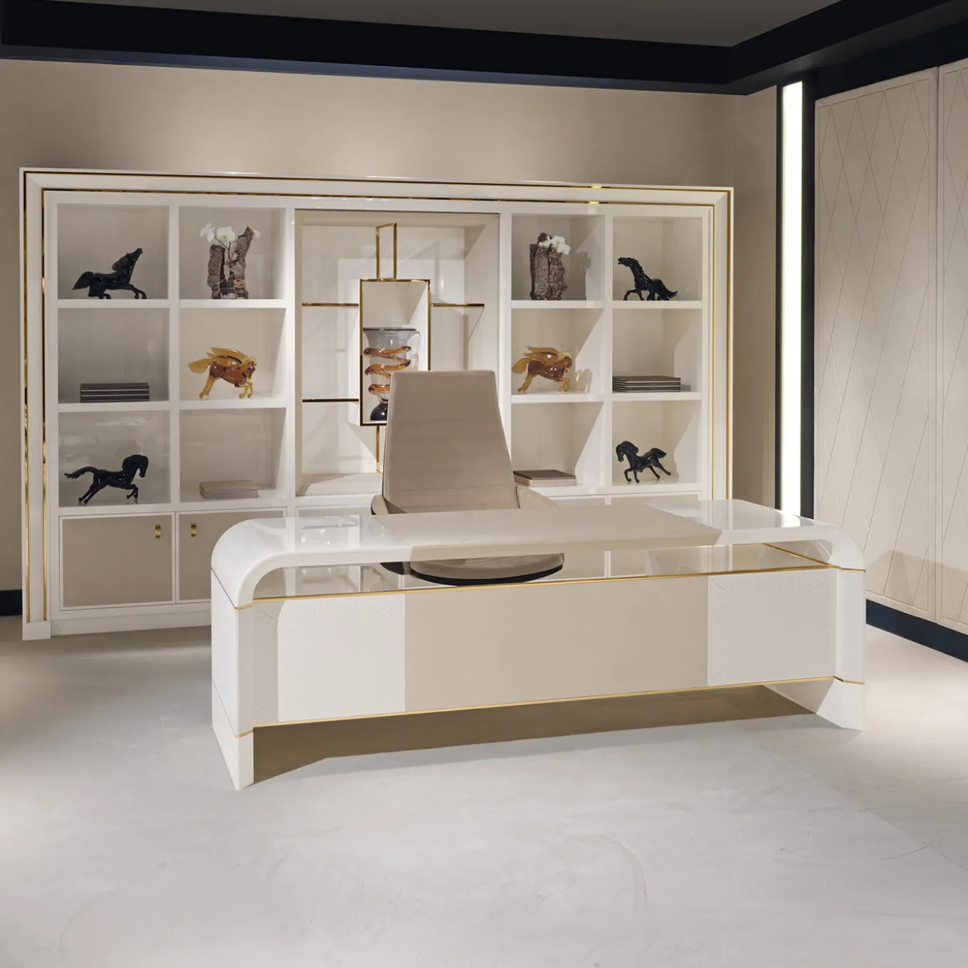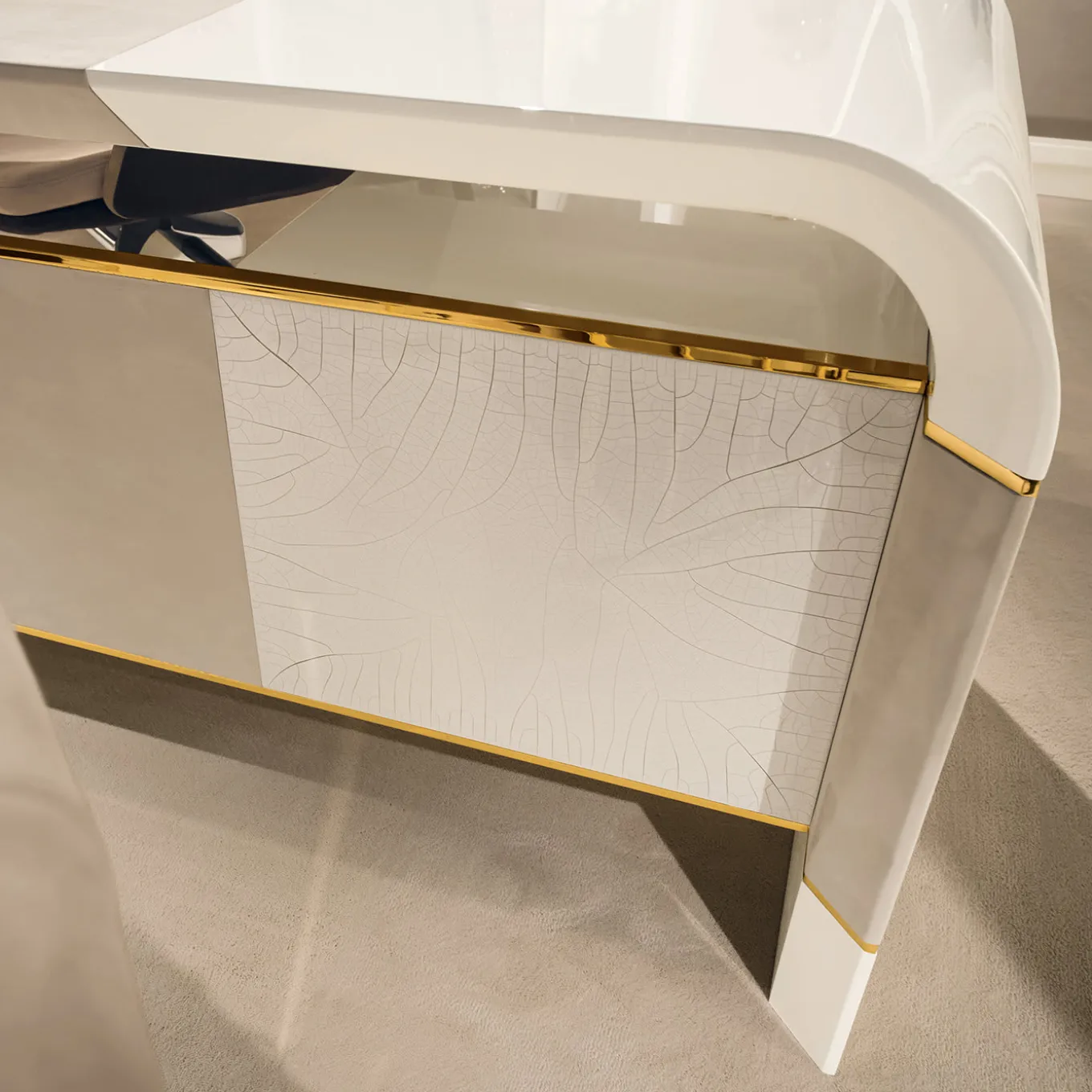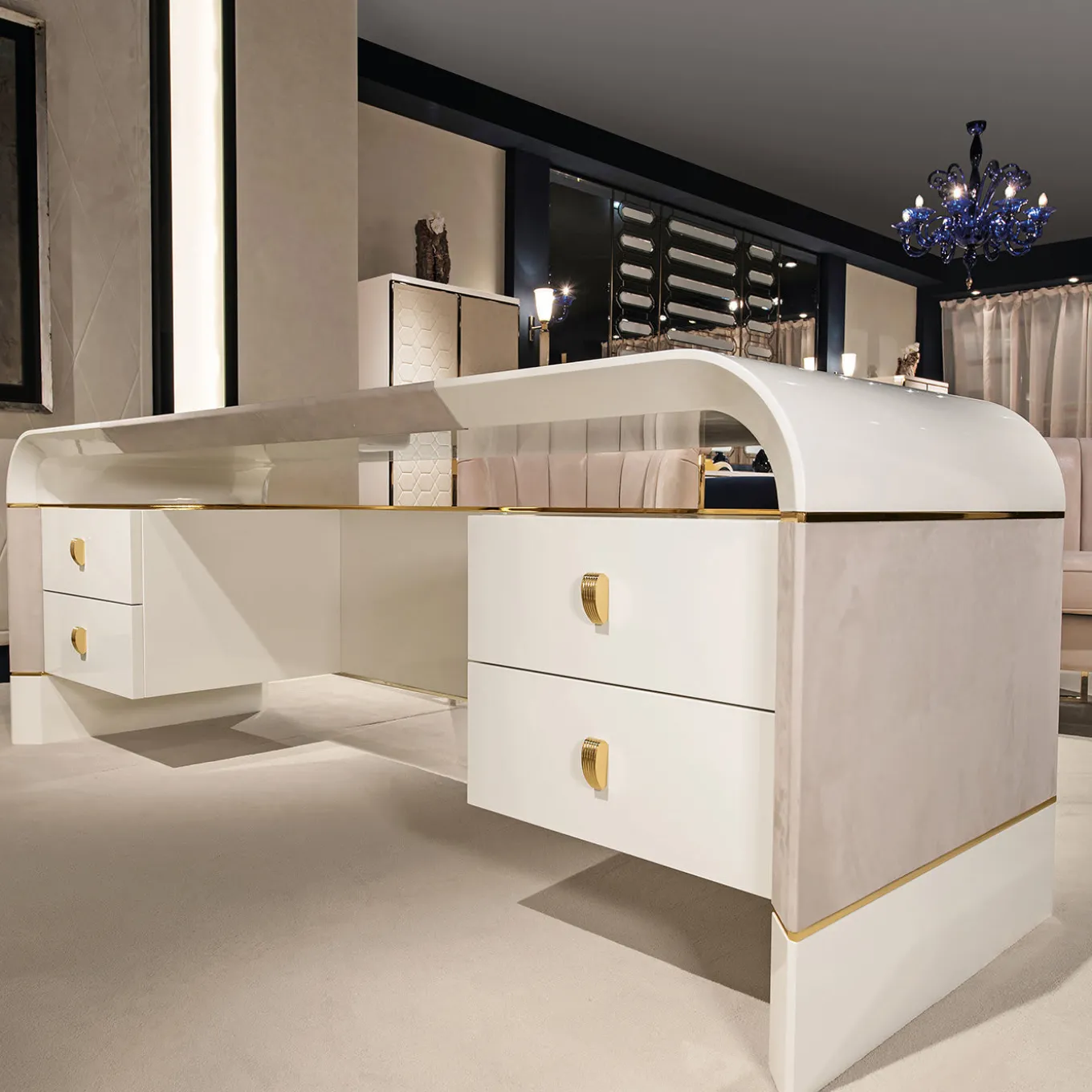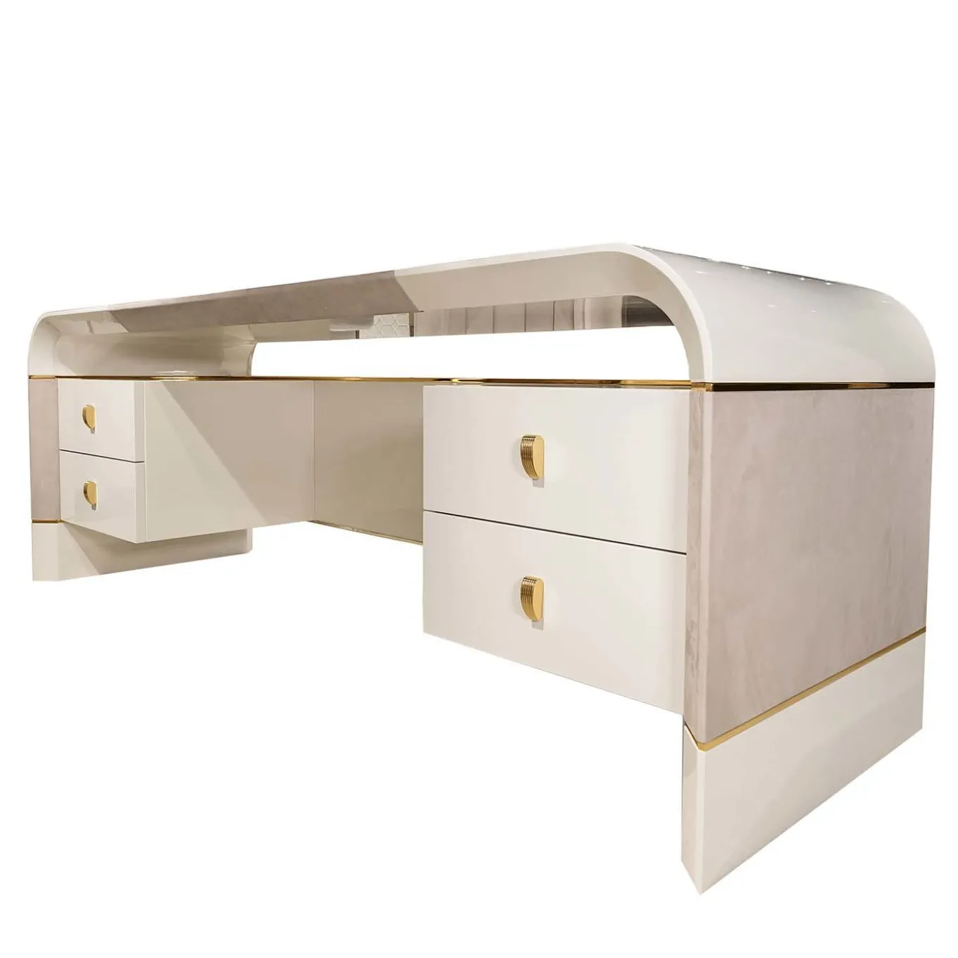 Azimut is a contemporary desk designed by Alessandro Masari characterized by sinuous, soft, and elegant curves. Glamorous yet functional, the curved corners of the top are juxtaposed against the sleek lines of the four drawers seemingly suspended underneath. The glossy ivory-lacquered finish of the desk is enriched with light gray nubuck leather inserts and polished gold detailing, including the distinctive drawers’ handles.