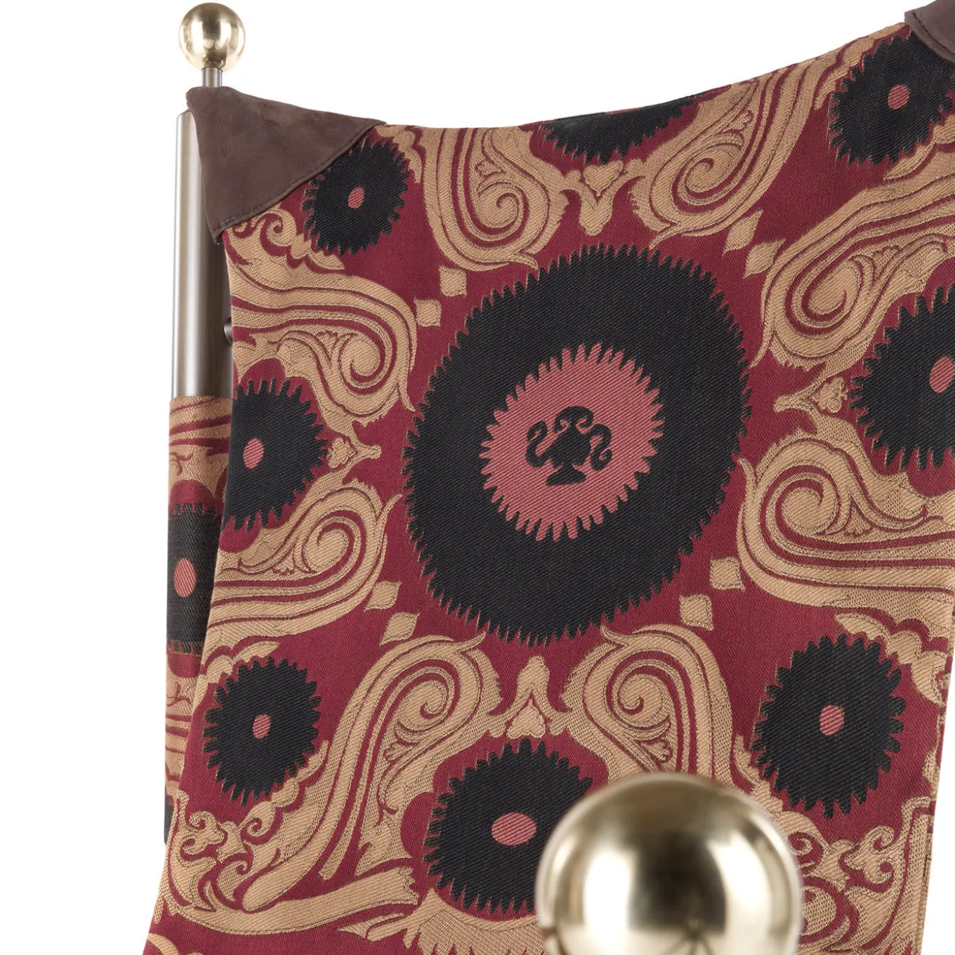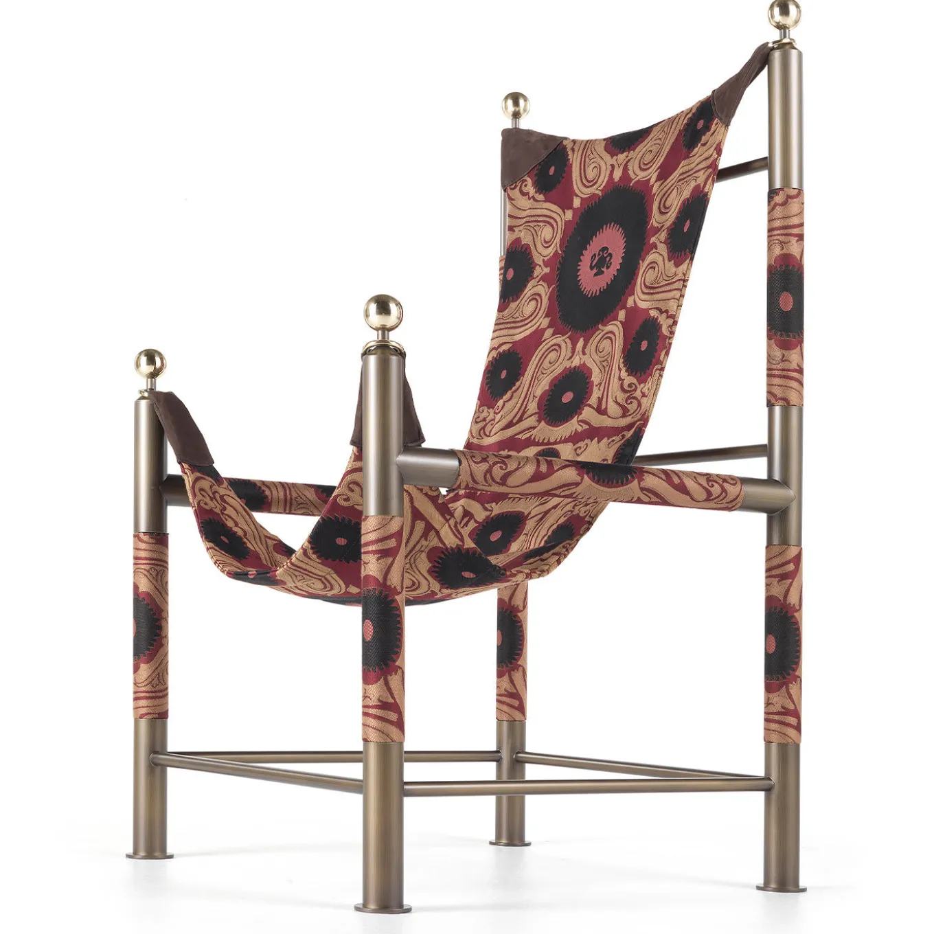 The iconic piece, part of the ‘Nomadic Story’, inspired by travels in India and Western Asia, in which the power of symbolic language is expressed through the masterful use of fabrics and of the brand’s quintessential pattern, Paisley. The Babel seat has a shape reminiscent of that of a foldable travel chair, while still maintaining a refined, luxurious throne-like form. Thus, the voyage themed essence of the collection is enriched by a touch of irony, the tale of travel emphasized by the symbolic presence of a suitcase, a trusted companion to the distant lands so dear to the brand. Foldable travel chair with structure in patinated bronze metal. Upholstery in fabric cat. A Bukhara col. 1 Nomad. Details in leather cat. A Nuuk col. 1 Brown and polished brass L 71 D 70 H 129′ Travel trunk with the structure in wood. Upholstery as for foldable chair. Details in leather cat. A Nuuk col. 1 Brown and patinated bronze metal. Tips in polished brass. Please inquire with the Concierge.