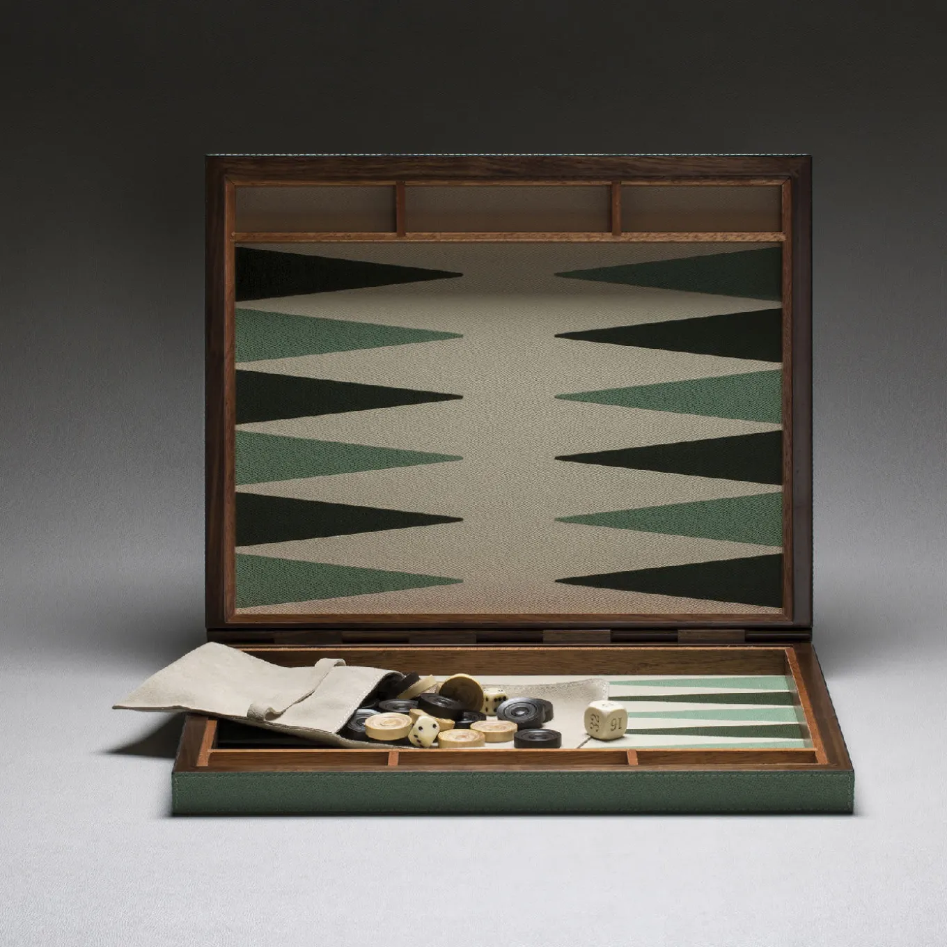 This elegant small backgammon case is made entirely in walnut wood and mahogany and uses walnut wood hinges. The playing surface is in inlaid leather and the color combination of the board can be customized. Checkers in boxwood and dice are included. A magnetic closing stores all items securely in, while the outside surface of the box is covered in elegant leather for a luxurious final effect. Different colors and types of leather are available from GioBagnara’s chart.