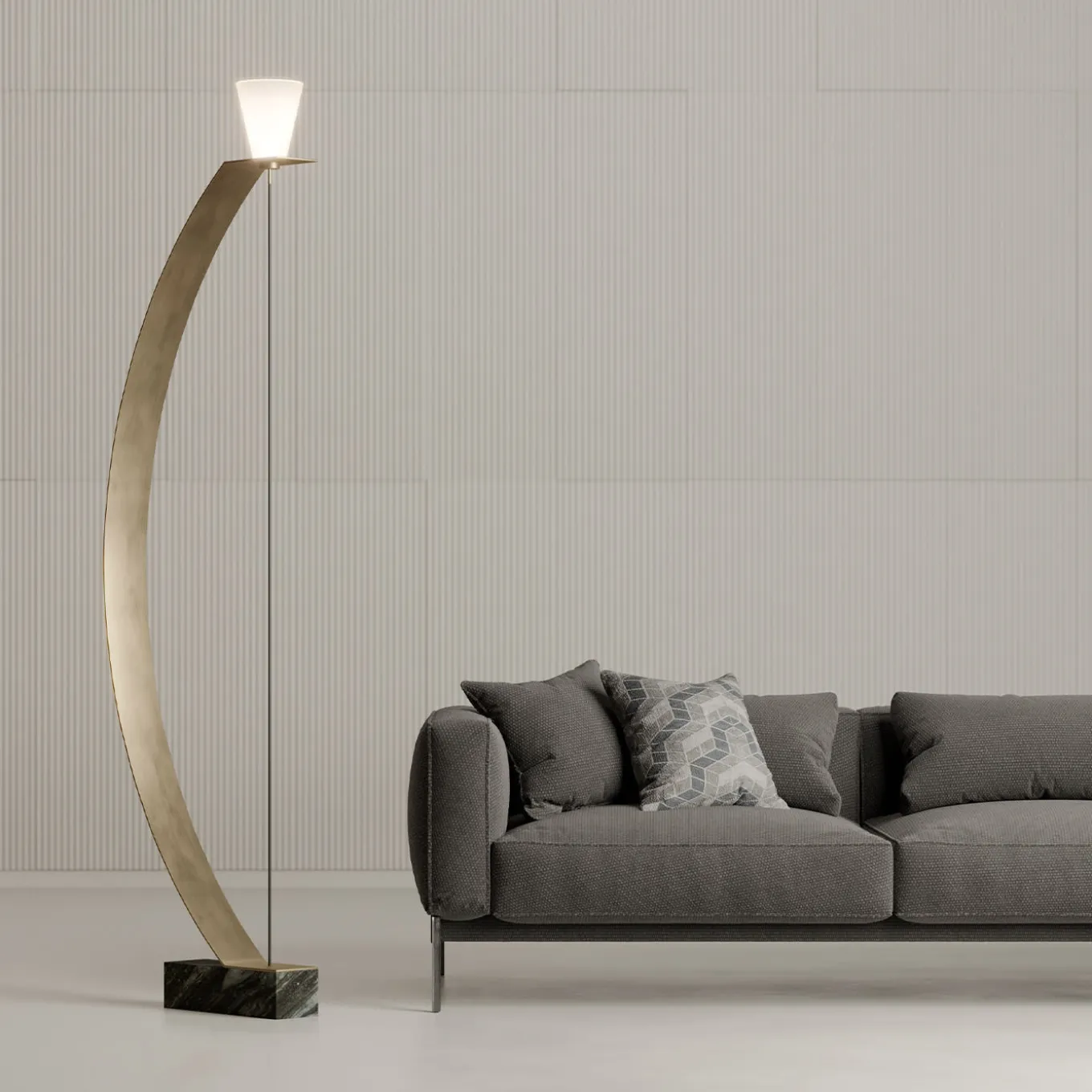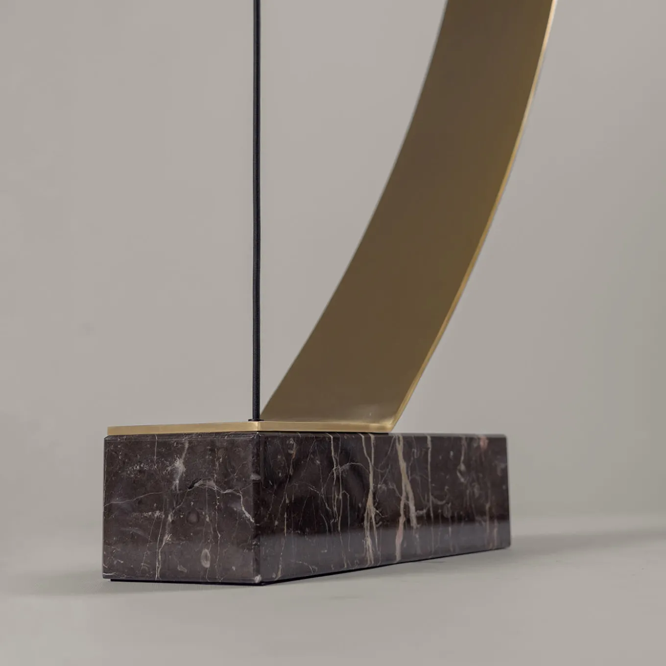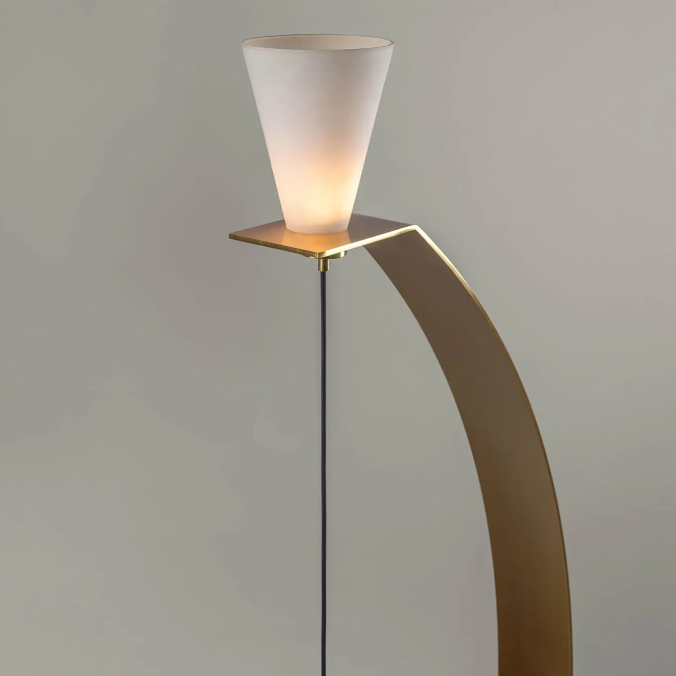 A sculptural artwork becomes a lighting fixture in this gorgeous design inspired by the unique shape of a crossbow. Playing on balance and tension, the structure is fashioned of black marble and satin gold-finished brass. The reverse cone-shaped lampshade is fashioned of satin opaline glass – also available in aluminum or in a colored variant, please ask the Concierge for details. It supports an LED bulb (24 W, 1560 lumens, 3000 K).