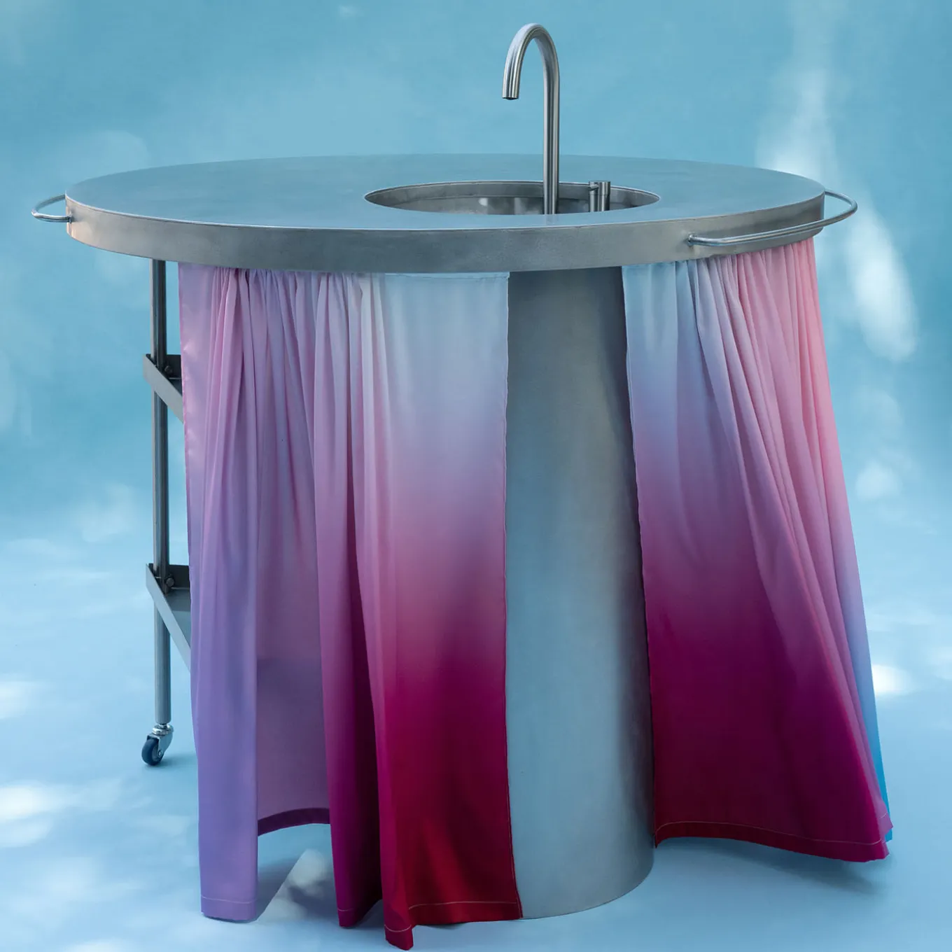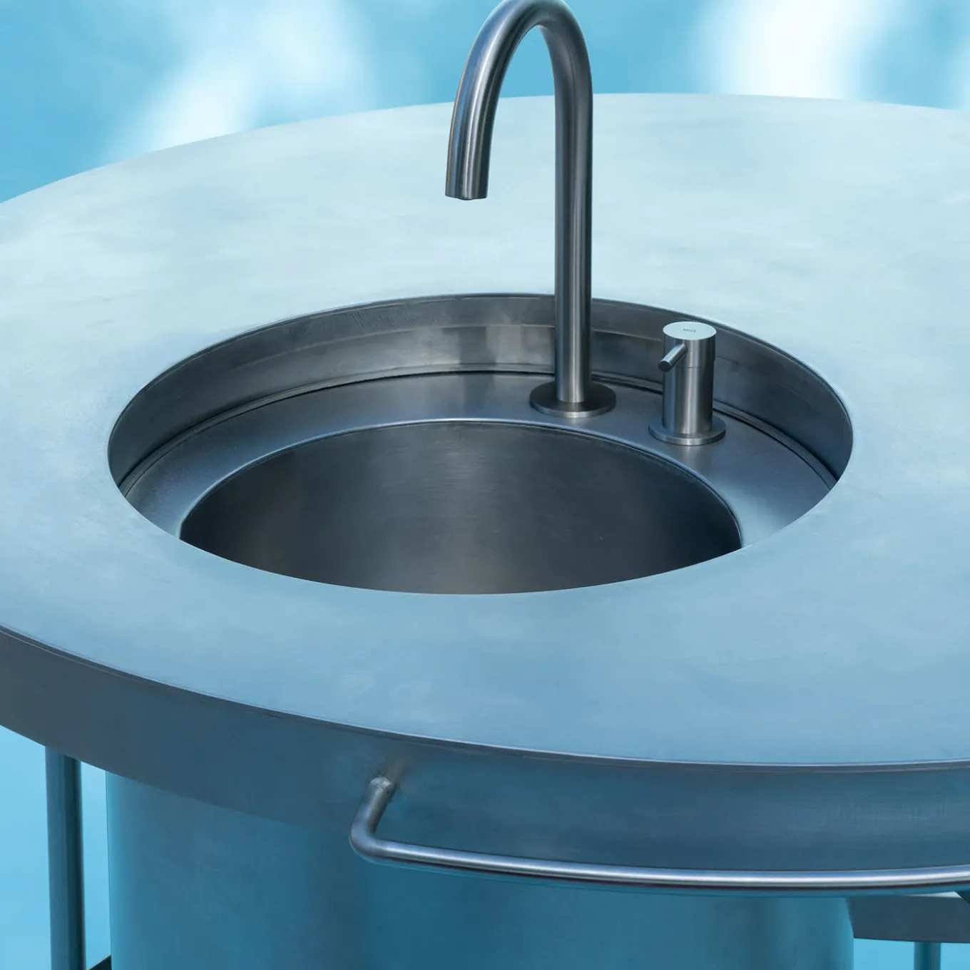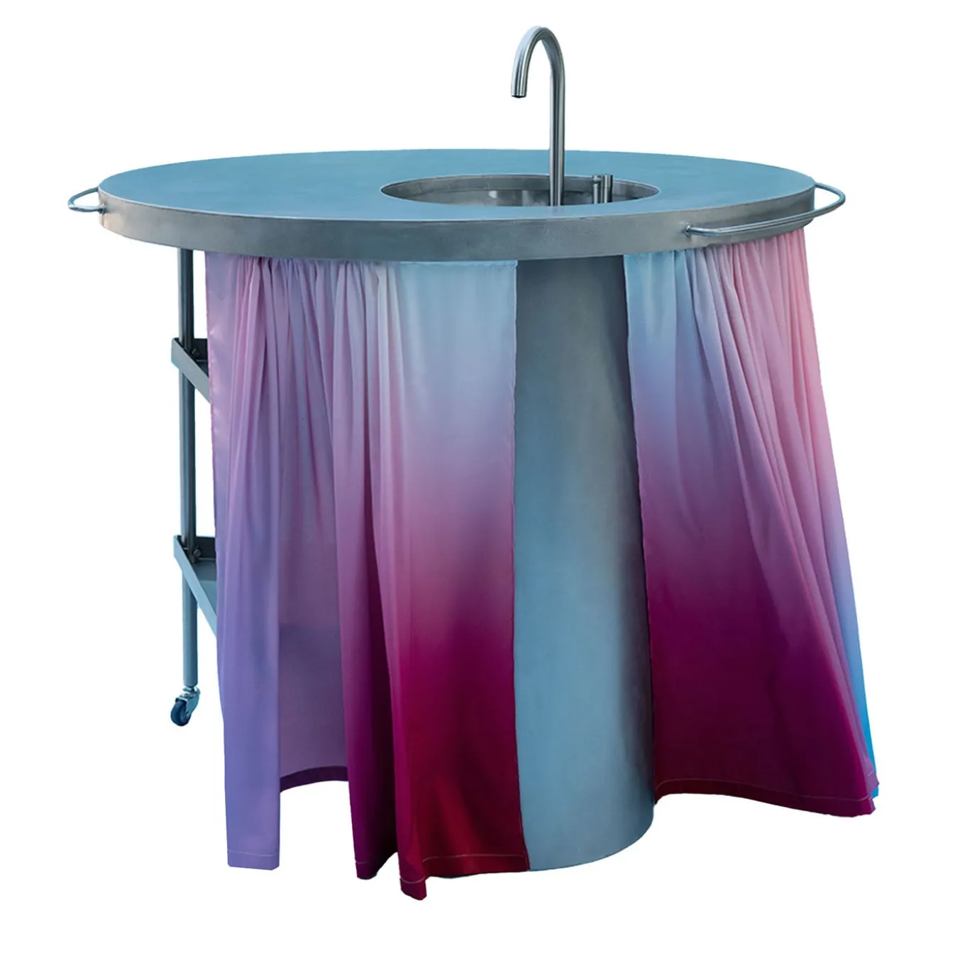 Introducing Ballerina by designer Federica Zama, a revolutionary kitchen island that transforms cooking into a joyful experience. It features a stainless steel top, adjustable triangular shelves, and a hand-welded cylindrical sink. Its mobile design allows for easy movement indoors or outdoors. A hidden runner lets you customize the look with curtains made from recycled fabrics. Available in various sizes, with options for a sink and induction hob. The faucet is not included.