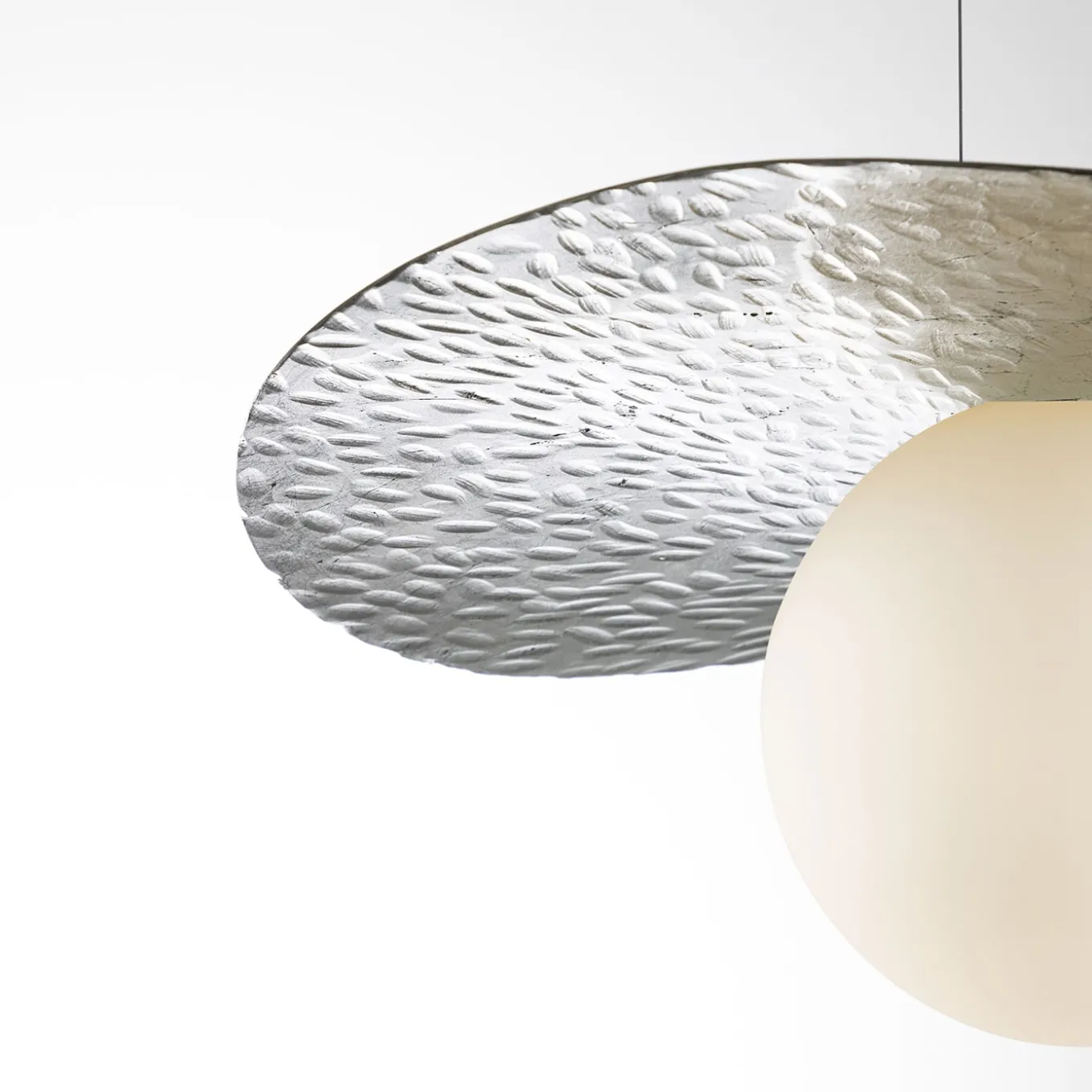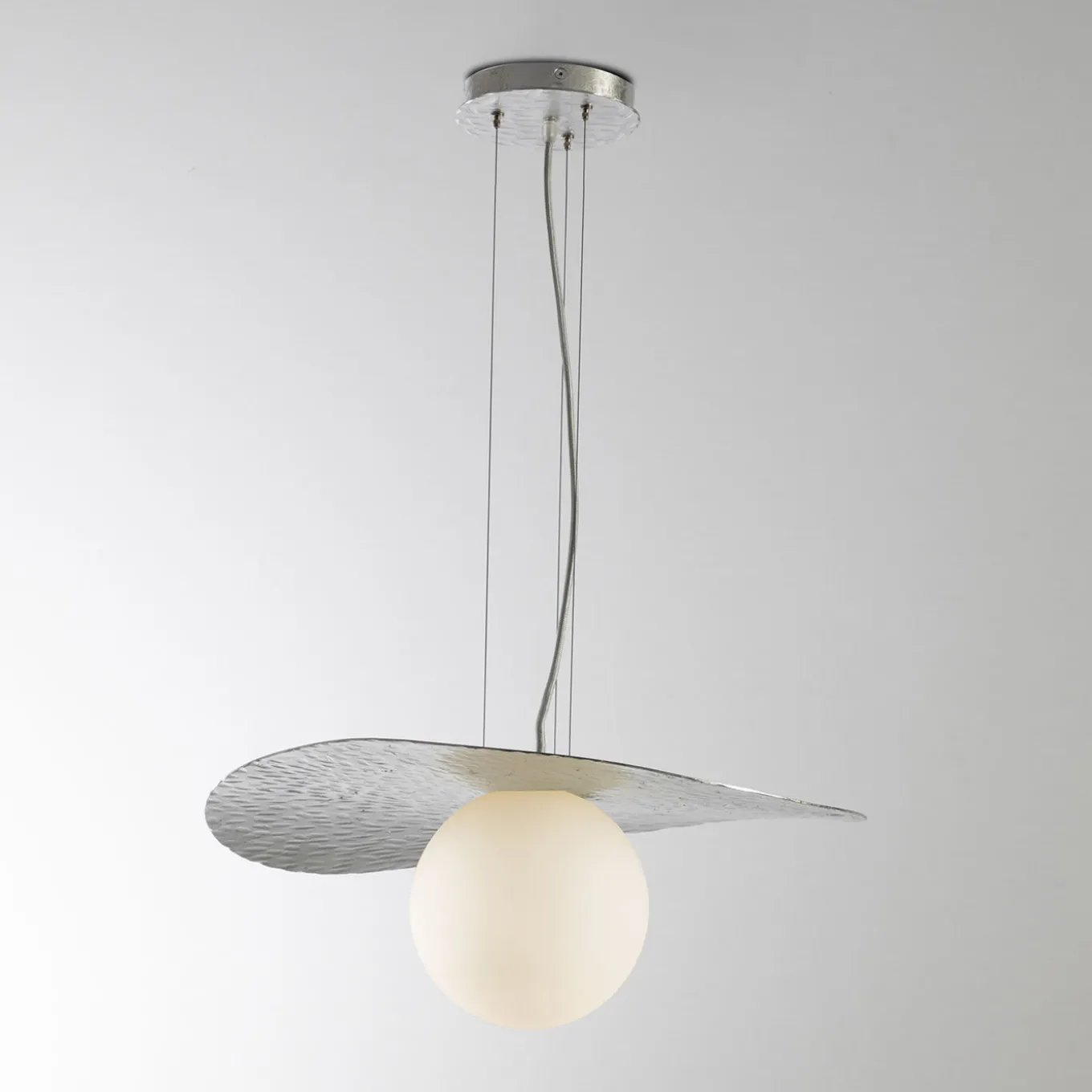 A celebration of ethereal grace and artisan mastery this pendant lamp seduces with its precious finishes and delicate profiles. The petal-like silvery silhouette is enhanced by its etched texture by the glow that filters through the spherical white glass diffuser – where a single E27 cylindrical bulb is housed – which allows for a warm and sophisticated ambiance. Please contact the Concierge for technical specs. Dimmable on request.