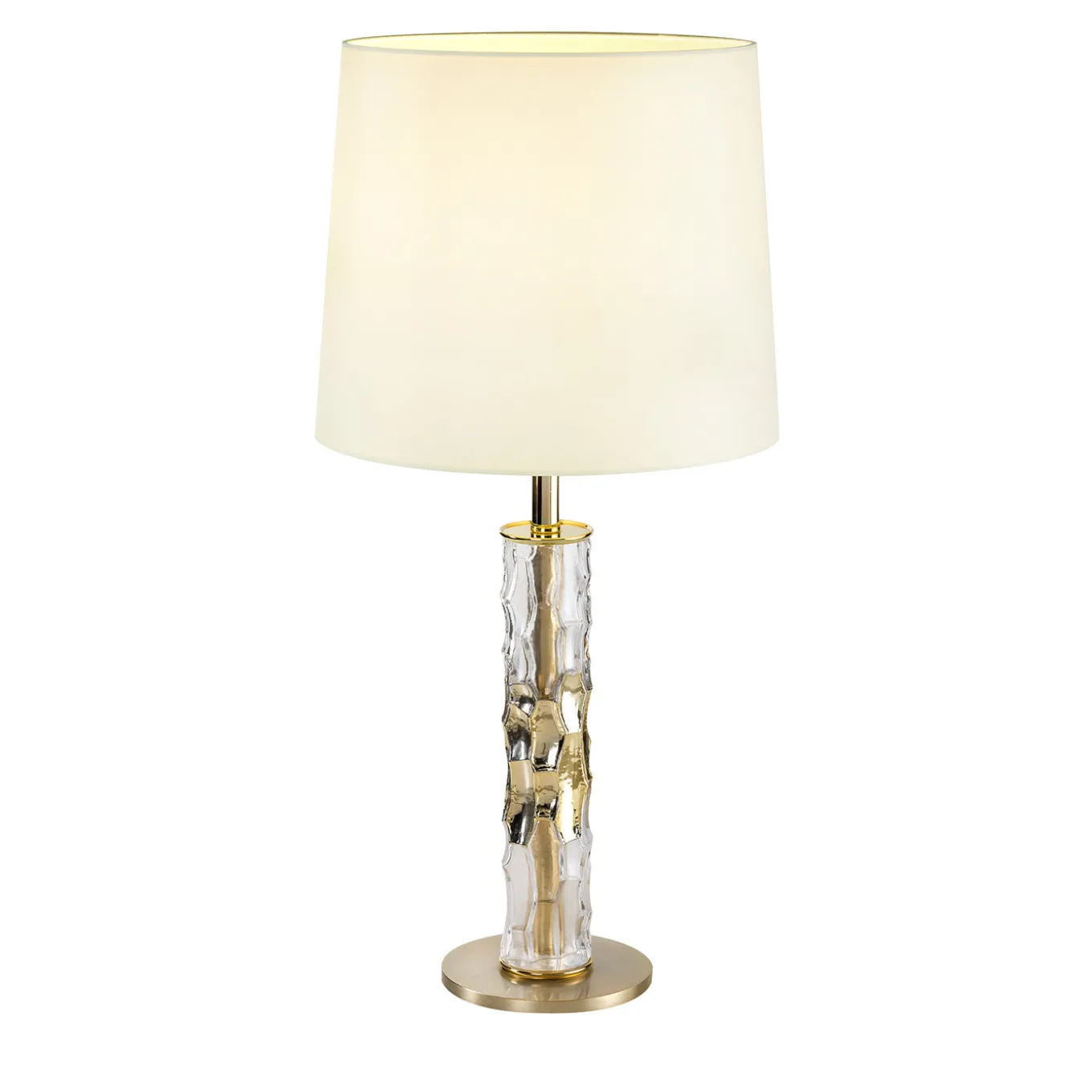 This table lamp features a base finished in satin 24kt gold with a textured transparent glass column accented by a gold metal band. Topped with an ivory chinette shade that softly diffuses light, it combines natural motifs with refined metallic details to enhance any desk or bedside setting. Bulb not included.
