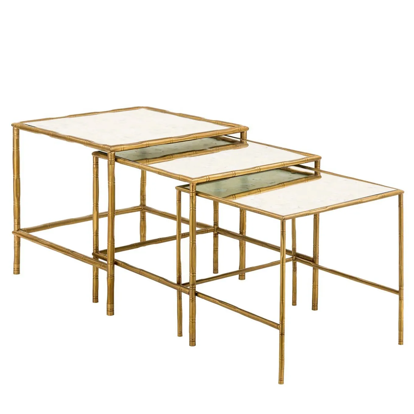 Versatile and elegant, this set of three side tables can be displayed together in a cluster of display surfaces of different heights, or in different areas of a study or living room, to add achieve a cohesive look. The structure is linear and open, crafted of brass in a shape reminiscent of a bamboo stick, while the top is in mirrored glass, adding a sparkling reflection from the surrounding light. The dimensions are: for the large 62 x 62 x H59 cm, for the medium 56 x 56 x H55 cm, and for the small x 50 x 50 x H50 cm.