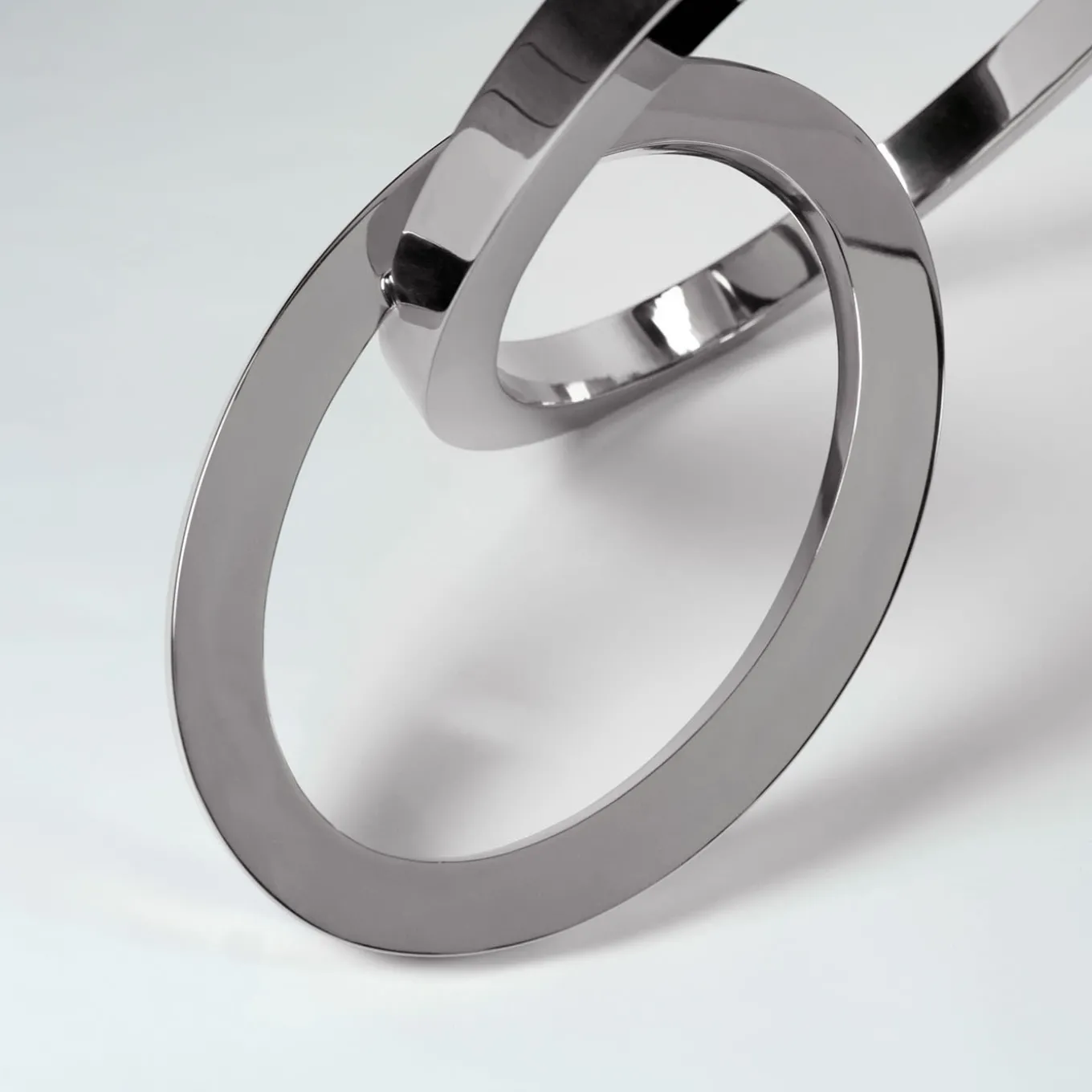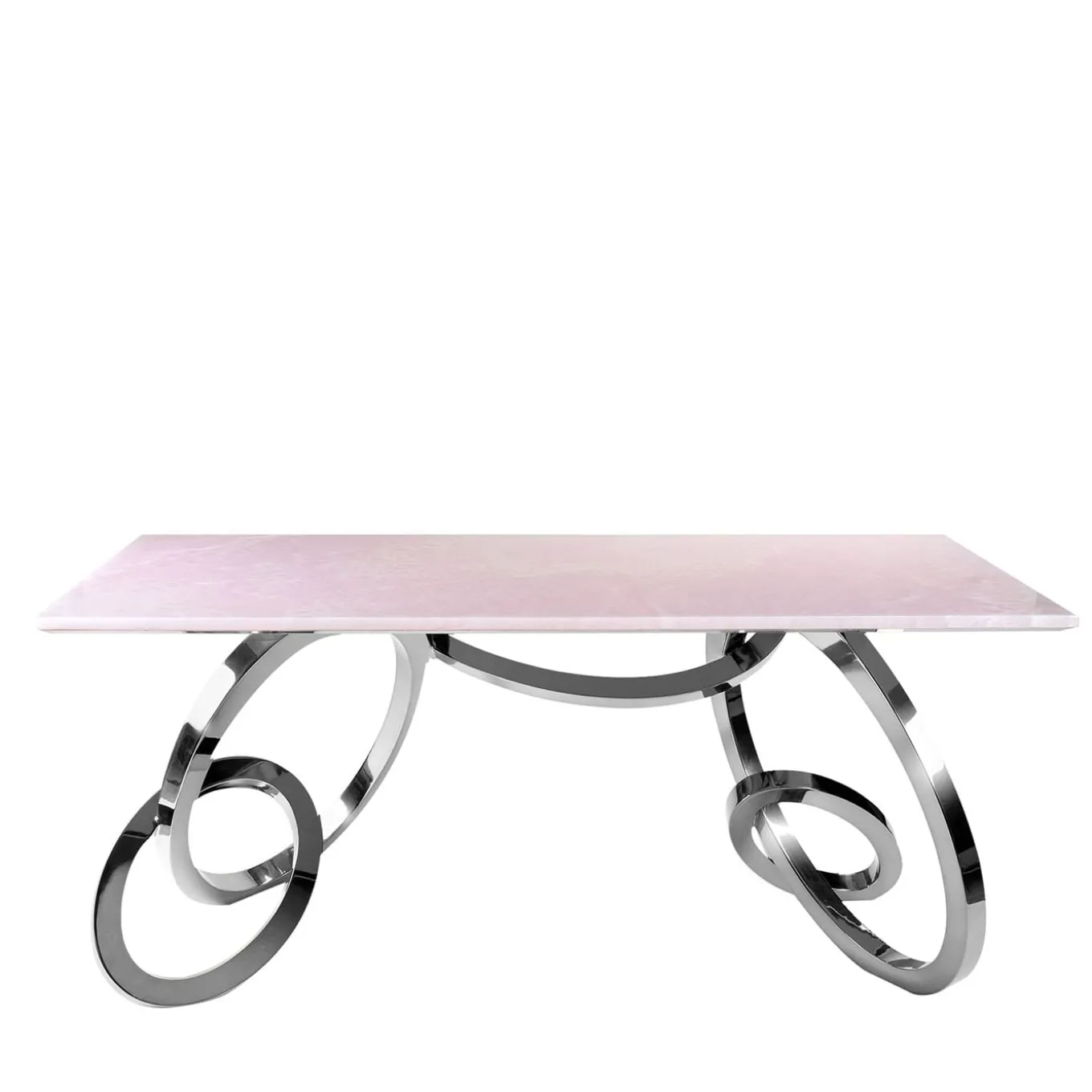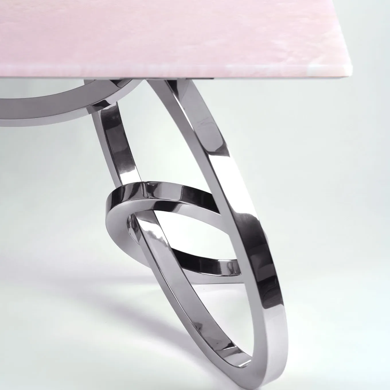 Bangles desk is structured in mirror-polished stainless steel and a top in rare pink onyx. Dimensions are customizable. Every single bangle is welded and highly polished by hand. The mirror-like finish of the steel creates different perceptions of this particular material and allows interesting reflections of light. Each table is hand signed and numbered by the artists. 100% handmade in Italy, comes with a “Certificate of Authenticity”. Dimensions are customizable.