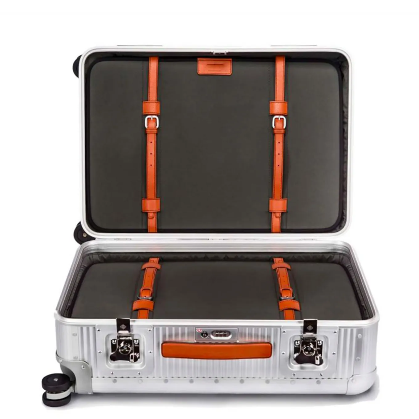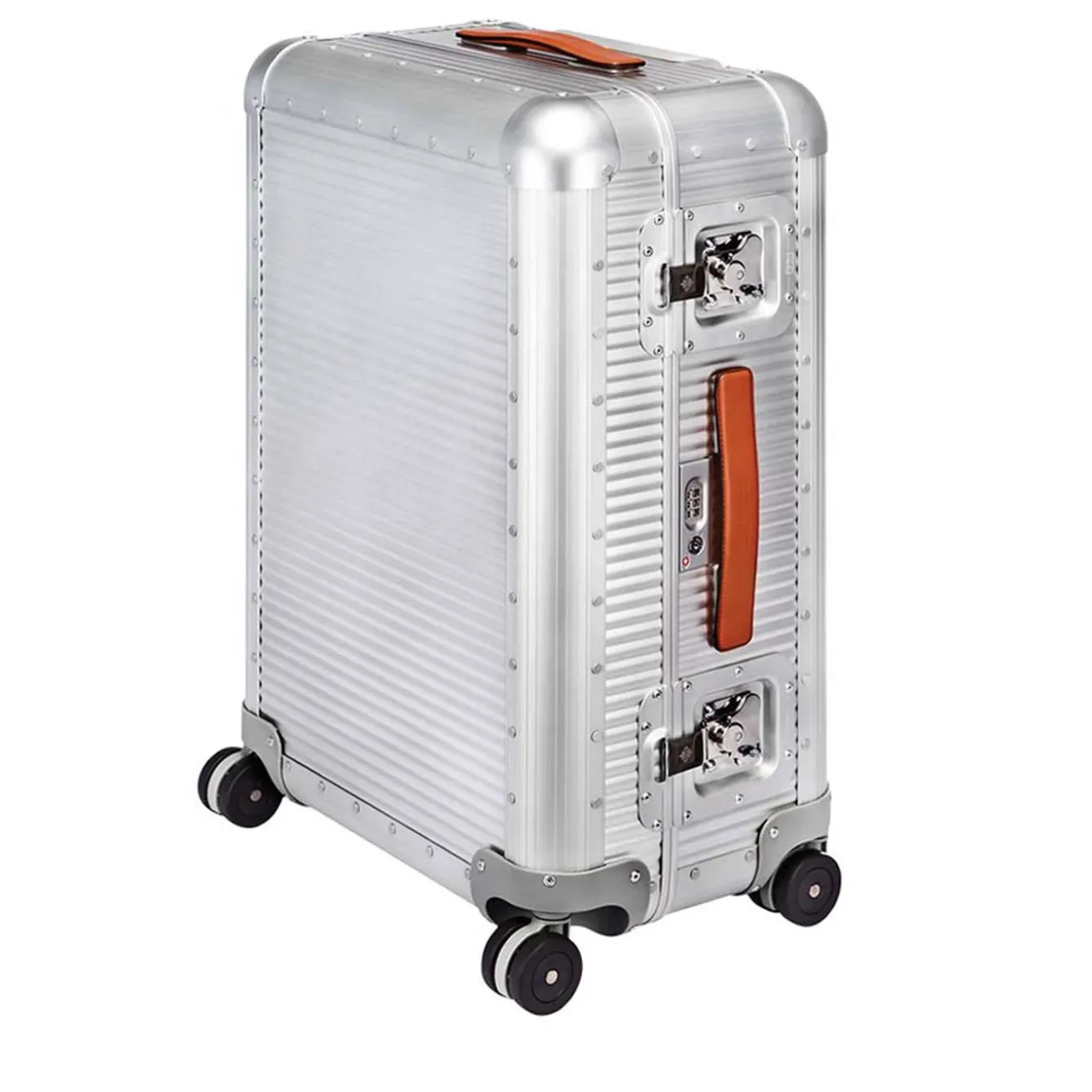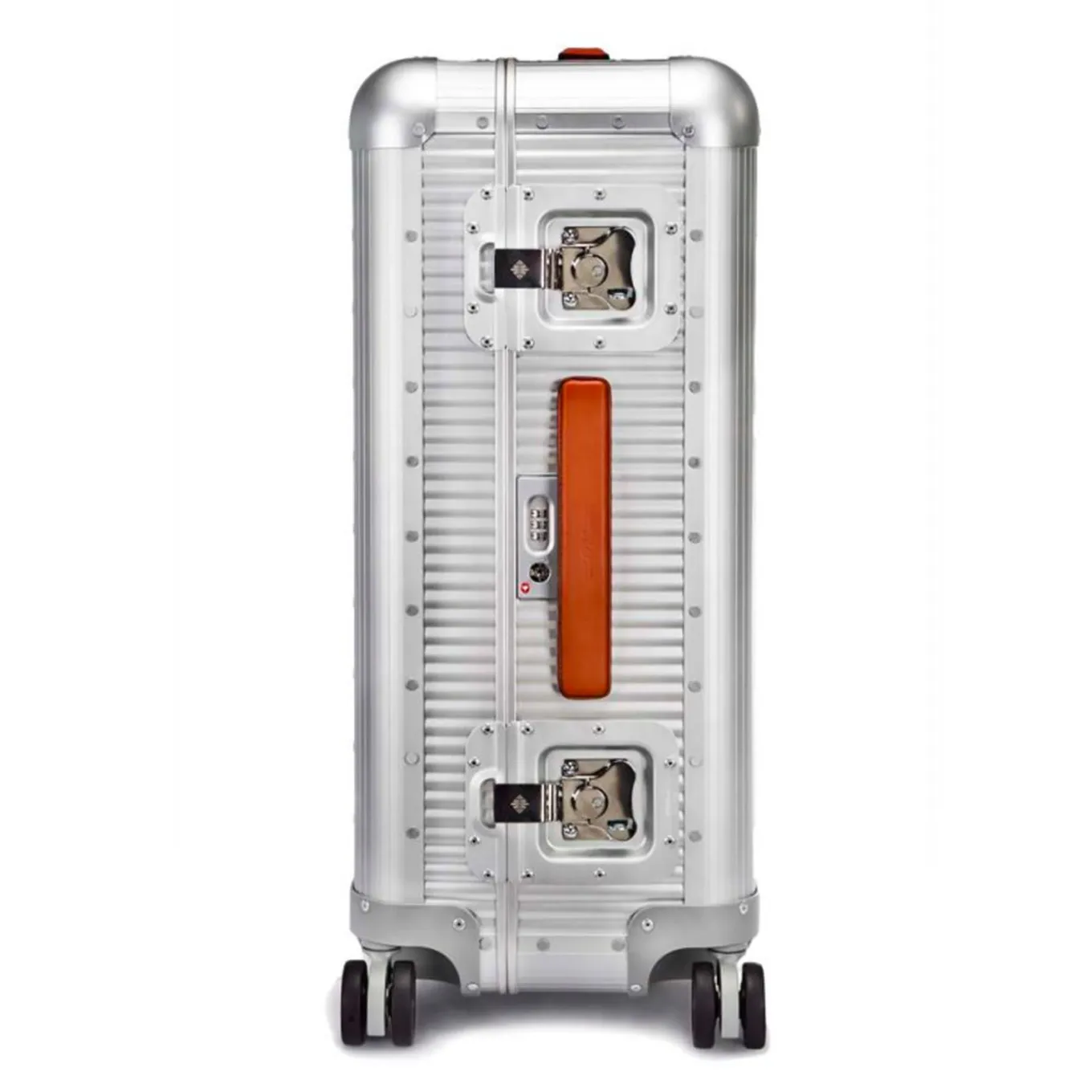 Exclusively Made in Italy, the Bank suitcases are inspired by the olden day trunks revised in a modern way. The aluminum shells, 10 microns (?) thick, combined with the special Butterfly locks, guarantee protection and resistance to the elements. The dual wheels ensure ease of transport and the interior with compartment dividers and leather details provide a perfect organization of the content.