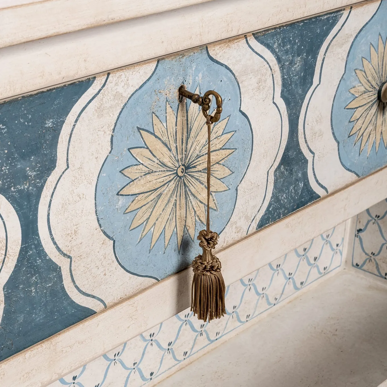 Introducing Barberini Chest with sunflower decor in deep sea blue and parma blue tones. The ribbon decoration inside the drawers adds a delightful touch. Customizable in size and design. Please, ask the Concierge service for further information.