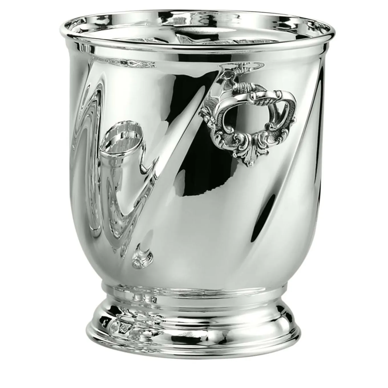 Incorporating elaborated details of the 17th and 18th-century style, this superb champagne bucket features a smooth, shimmering silver-plated finish. Two decorative handles with entwined swirls embellish the sides of the footed silhouette creating a superbly sophisticated look. This piece can be personalized with engraved monograms on request. Also available is solid silver and with partial or total gold-plating.