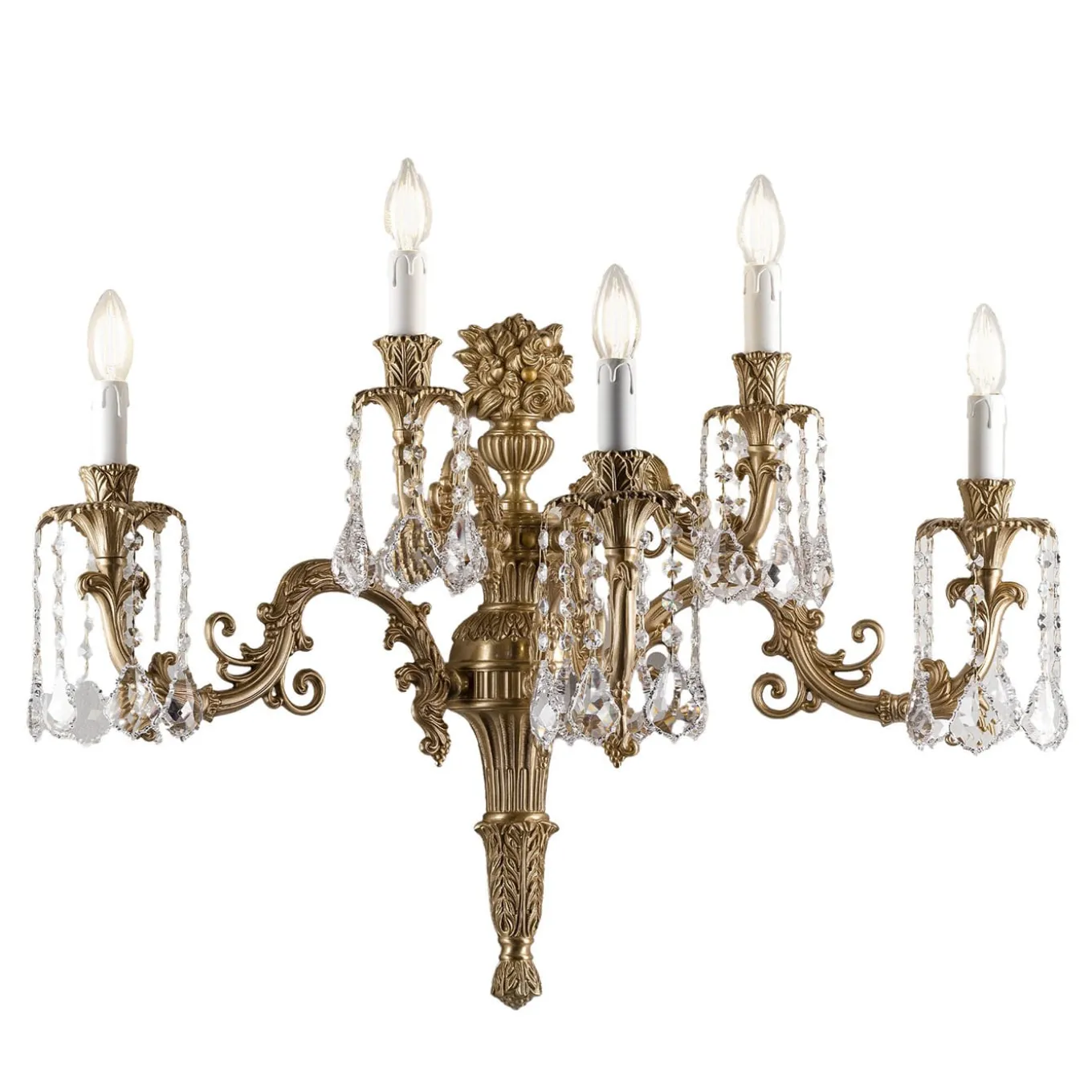 A statement of Baroque opulence, this wall lamp in fused brass makes for a spot-on addition to classic decors indulging in luxurious accents. Asfour® crystal pendants dangle from bobeches and five sinuous arms, their luxurious textural detailing enhanced by the glow emitted from the five E14 LED bulbs.