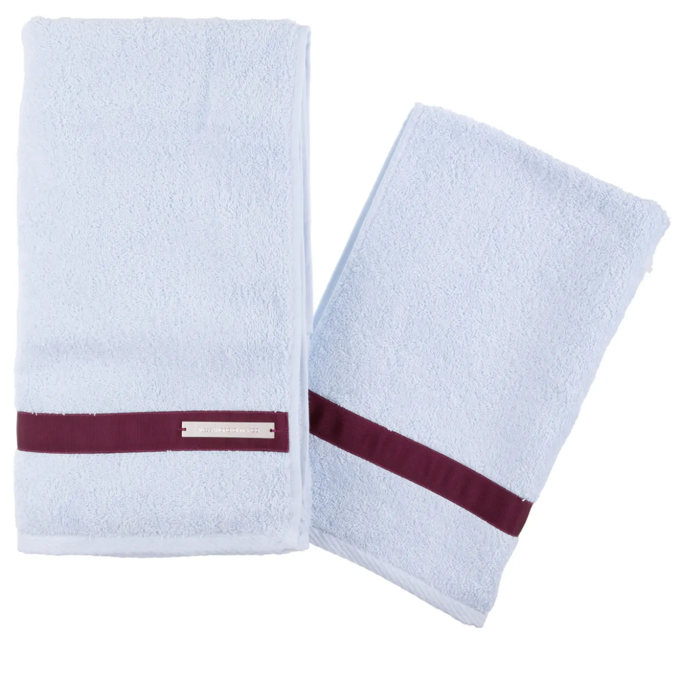 This elegant bath towel set comes complete with a small size as well as a medium size towel in Ice Blue, 100% soft Egyptian cotton, accented by a Burgundy ribbon. Metal logo plate has been embossed and sports a palladium finish.