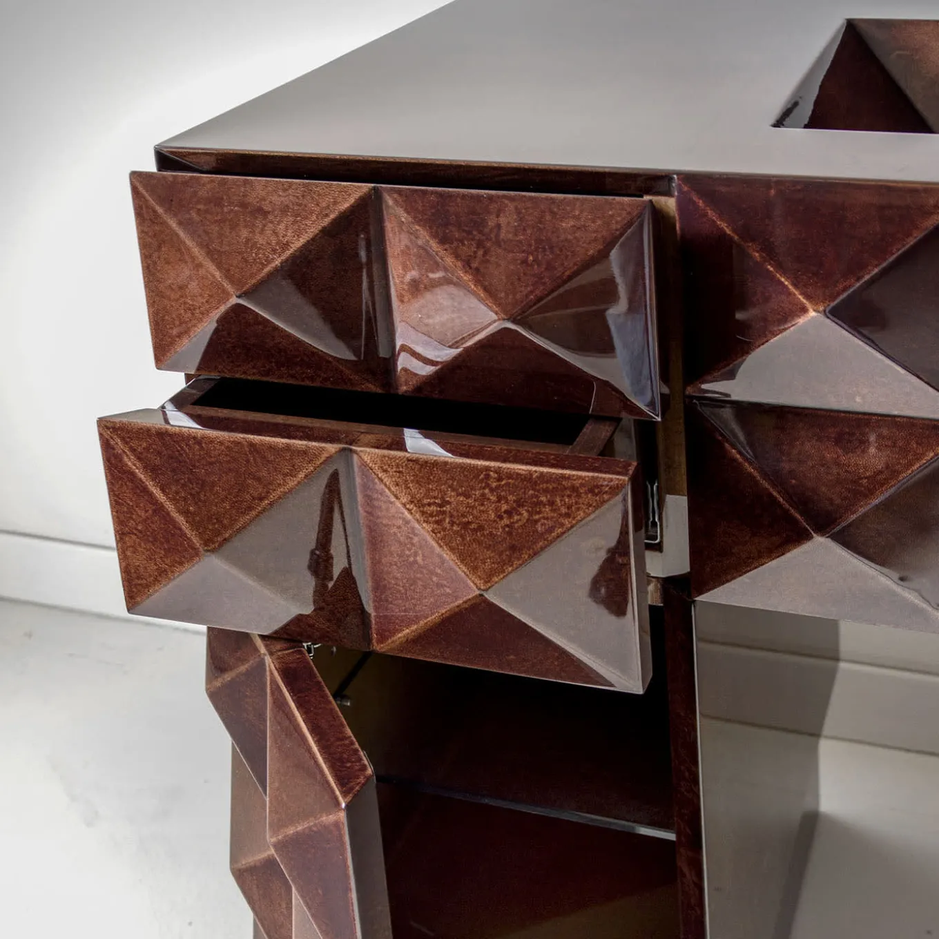 This exquisite bathroom ensemble designed by Giannella Ventura is entirely crafted in parchment with a rich mocha hue. Crafted to withstand the rigors of moisture and water exposure, it epitomizes durability and endurance. With push-open drawers and doors, convenience meets sophistication effortlessly. Its captivating front facade casts an enchanting optical illusion thanks to an intricate mosaic of small squares pyramid-like shapes. Faucets included as pictured.