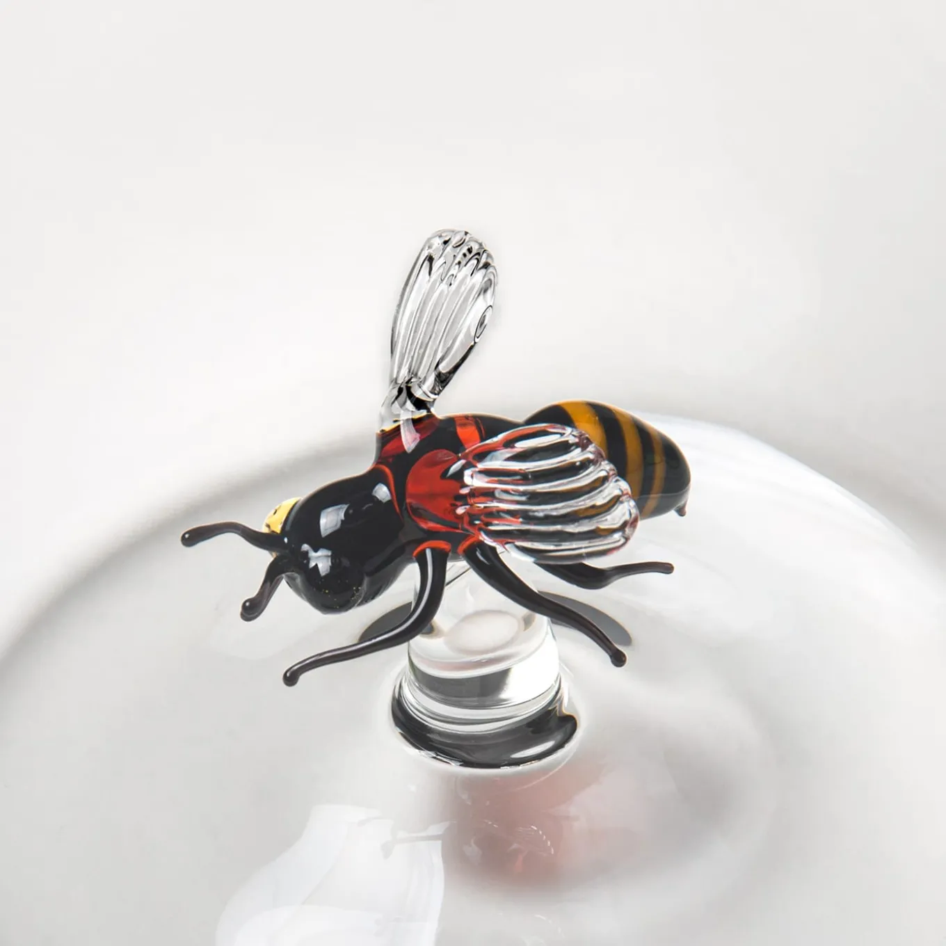 A sleek glass bottle, elegant in its iconic transparency. Within it, a small bee, portrayed in all its delicate essence, is the true protagonist of this work. The only note of color, represented in the smallest detail, from eyes to stinger.