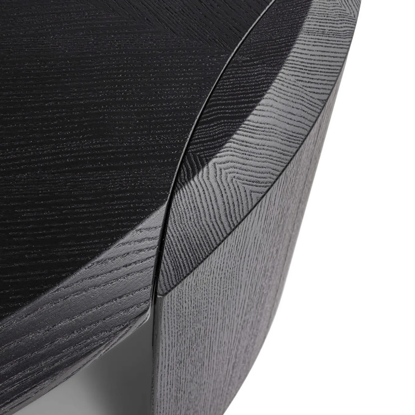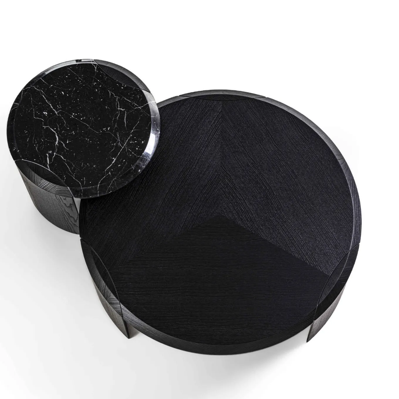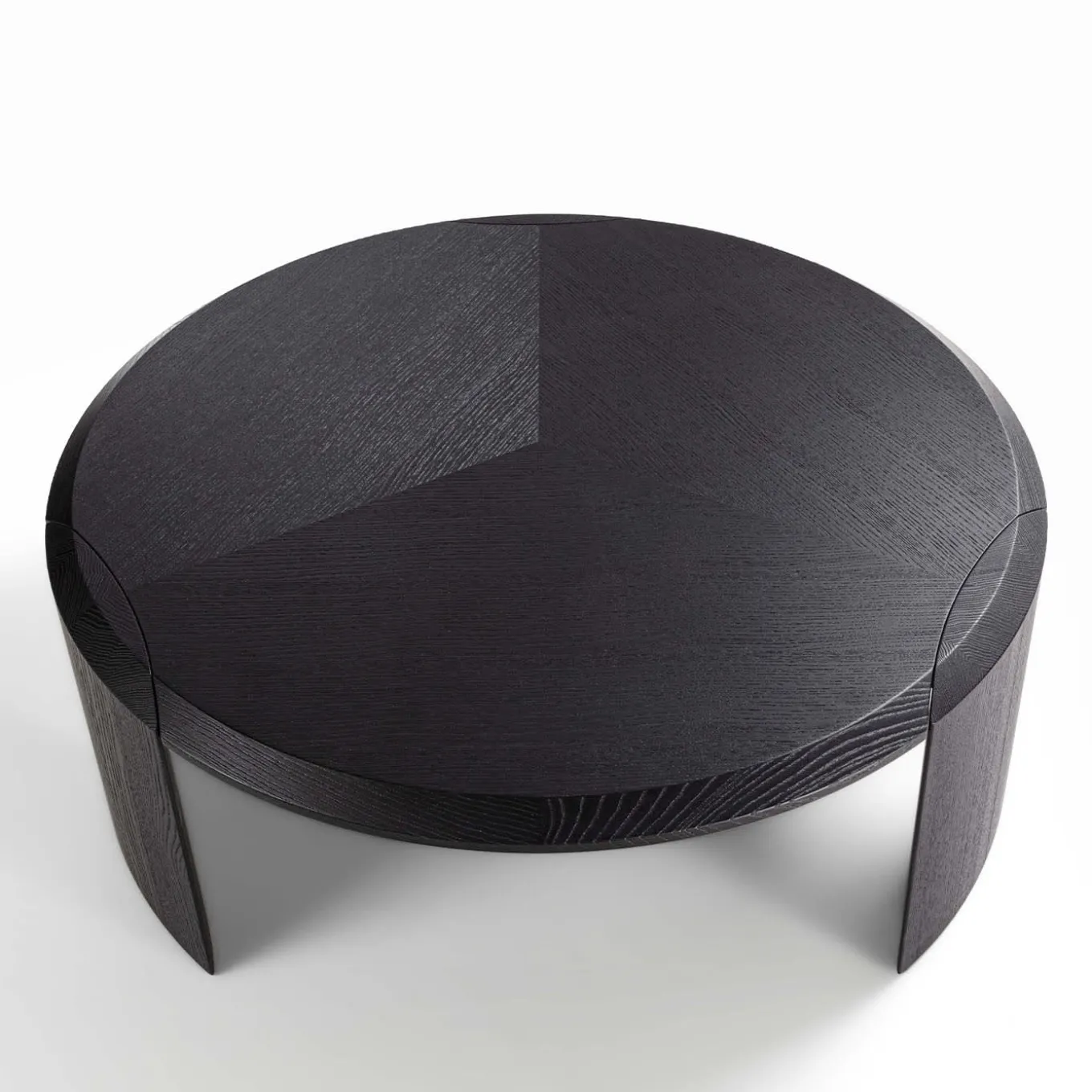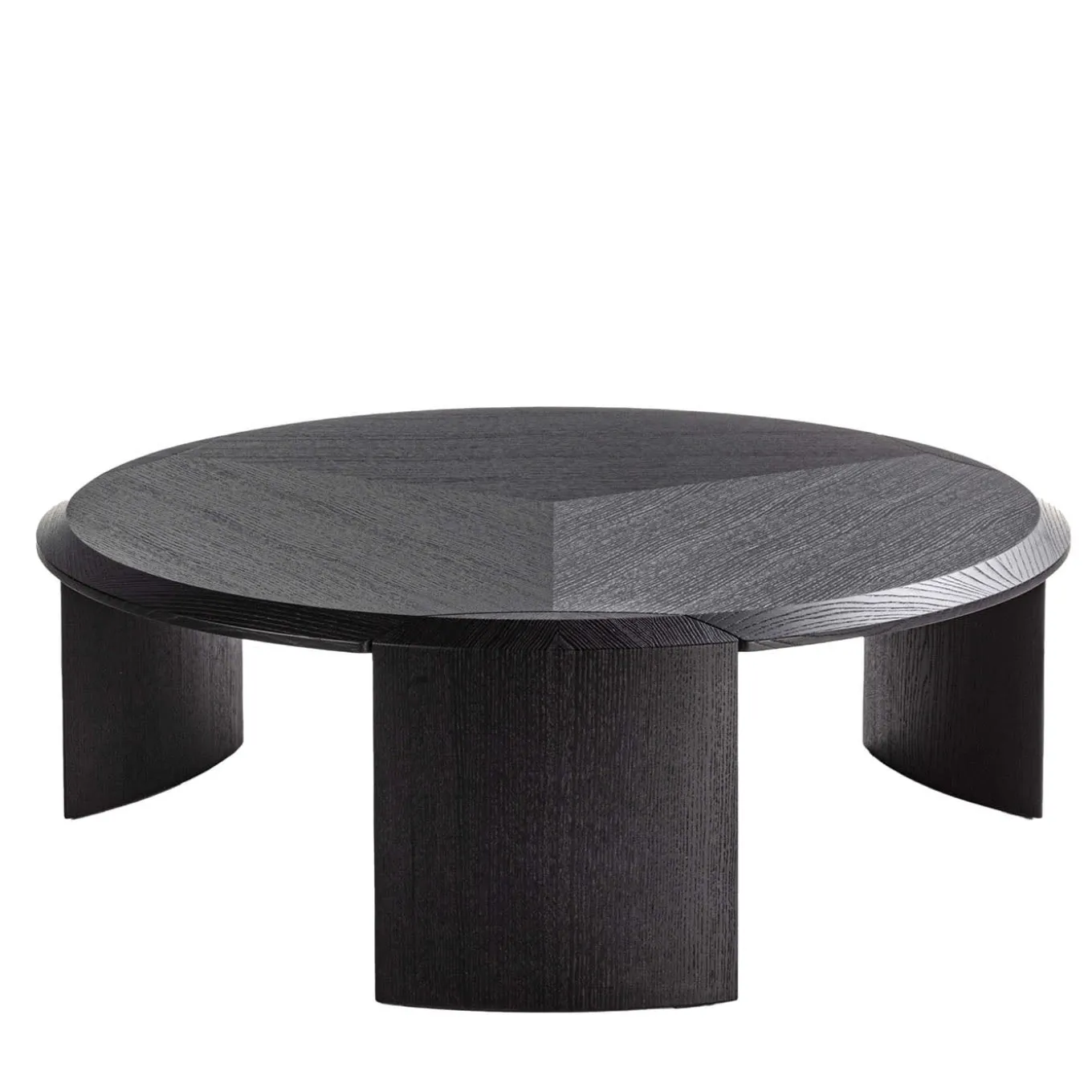 Fashioned of ash and showcased in a deep-black stain for a statement of unfailing class, this circular coffee table belongs to an elegant series of pieces distinguished by a special seamless joint assembling the top and almond-cut legs together. Larger options and versions with marble top are also available, please inquire with the Concierge for details and pricing.