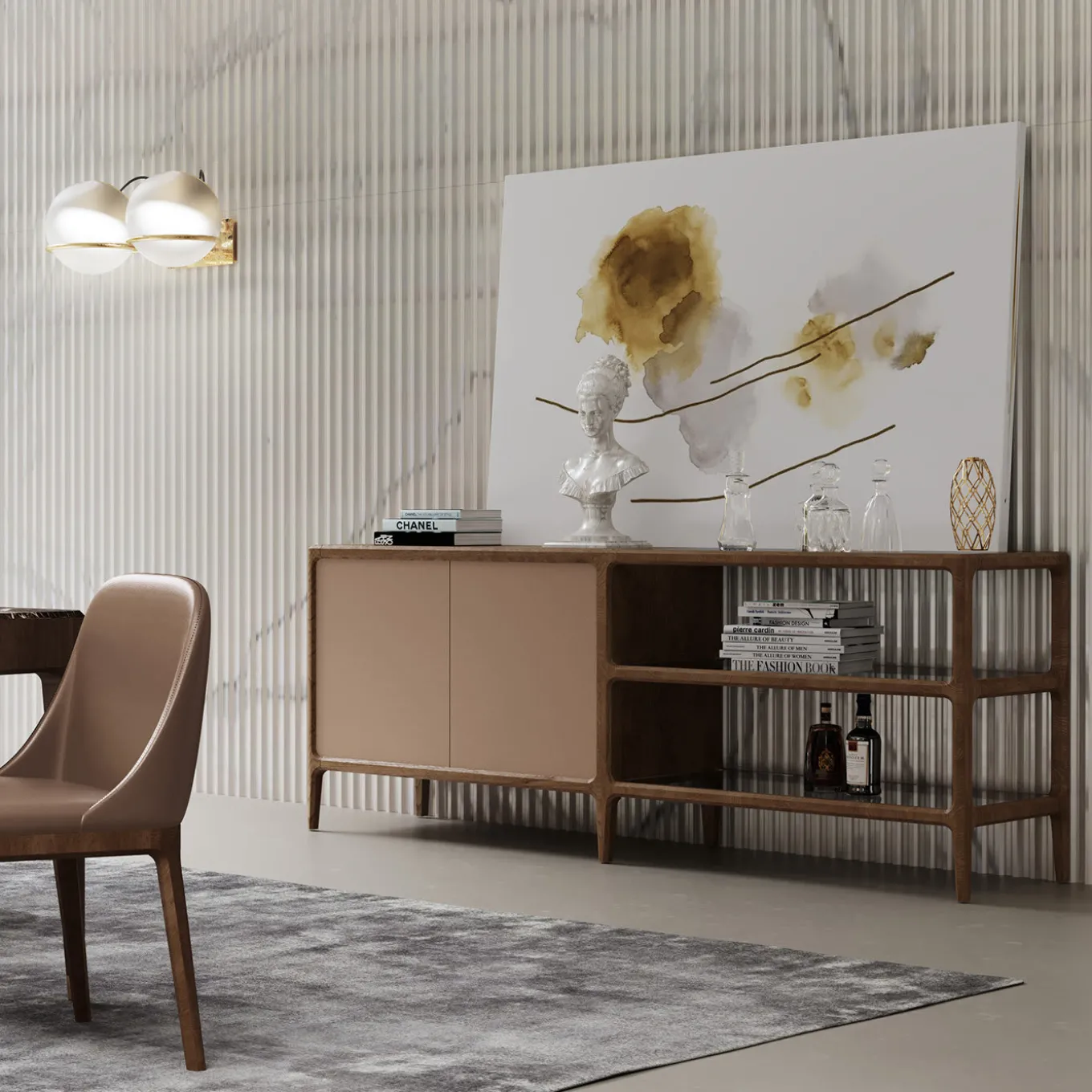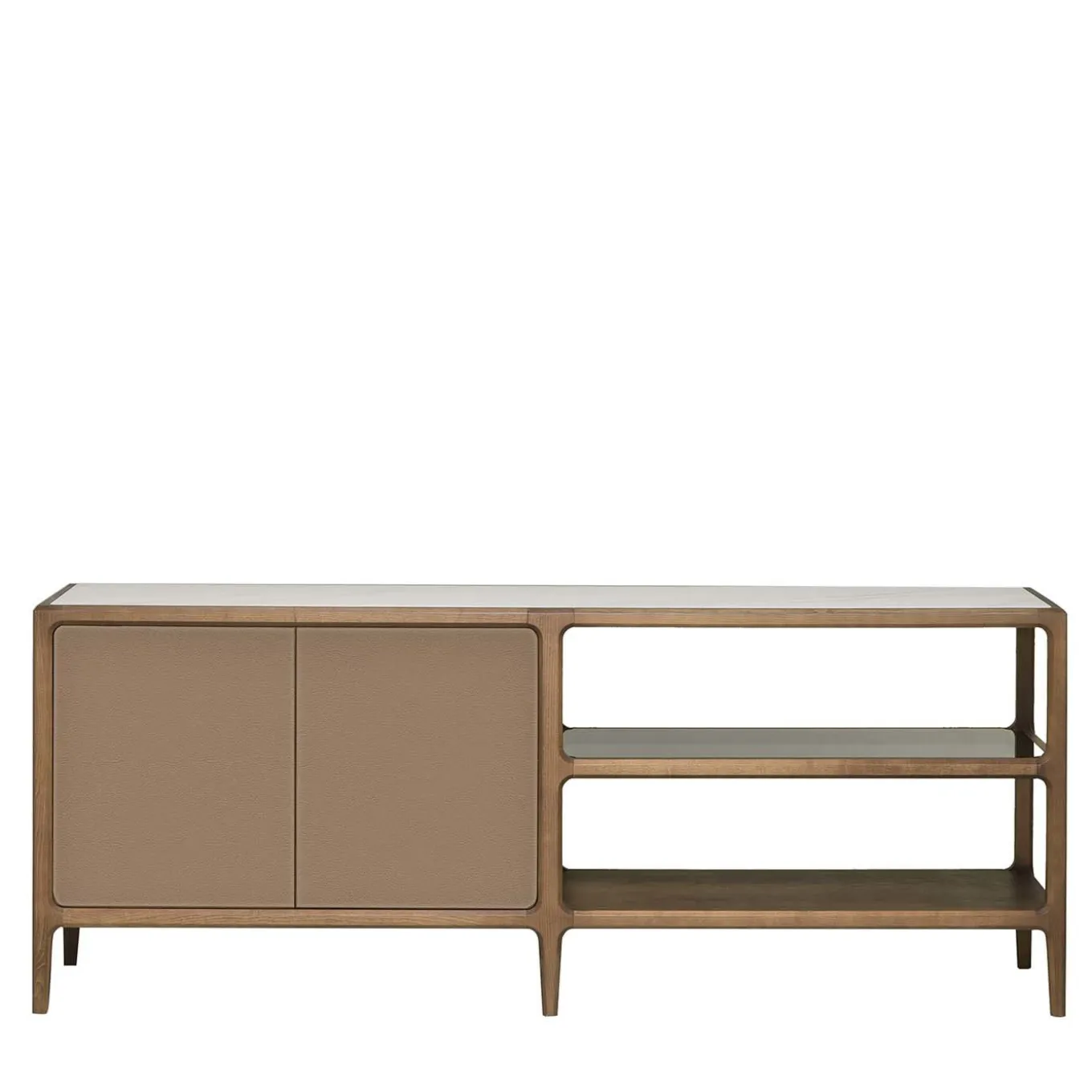 Bellagio is a new collection characterized by well-defined lines, wisely worked, which aims to satisfy the most sophisticated tastes, presenting itself with refined objects preciously finished in every detail. The sideboard in ash wood features two doors and an open compartment. The doors are in wood or covered in beige leather and boasts a calacatta ceramics top. Mixing refined, rigorously natural materials with a finely worked solid wood structure, Bellagio offers complete furnishing from the living area to the sleeping area. Designed by Libero Rutilo. Any shades of colors or veining, of marble or ceramics, may vary for each product. As each piece of furniture is handcrafted, the choice of natural materials is made for each individual piece of furniture created. The photos presented on the portal are to be considered indicative, as each piece is unique and unrepeatable compared to the others in the same collection, this distinguishes its originality and craftsmanship.