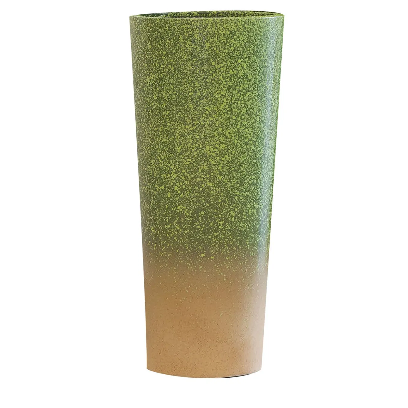 A dynamic V-shaped silhouette largely adorned with speckles following the gradient fading of green into beige characterizes this ceramic vase, a singular piece of artistic flair. Each piece is entirely unique, undergoing natural drying and +1000° firing steps monitored by master craftsmen. A large version, suggestive cohesive arrangements, is also available in the Artemest catalog.