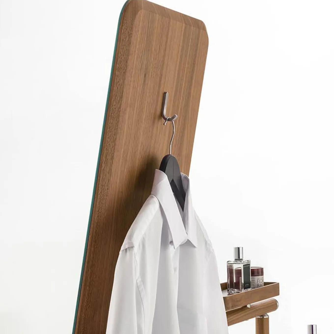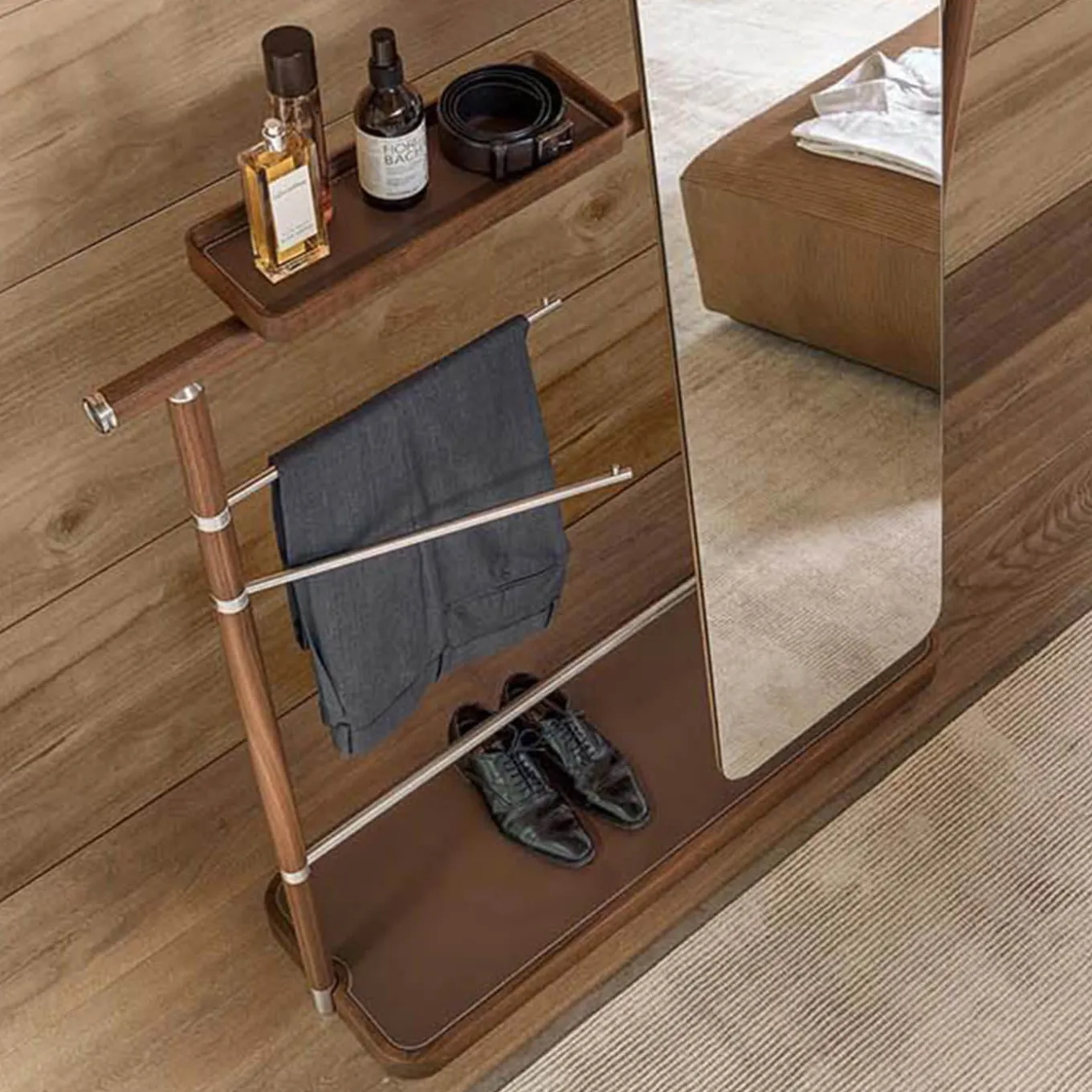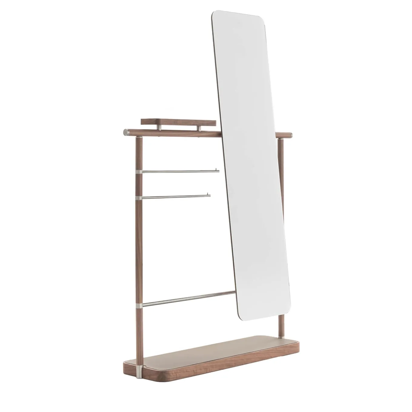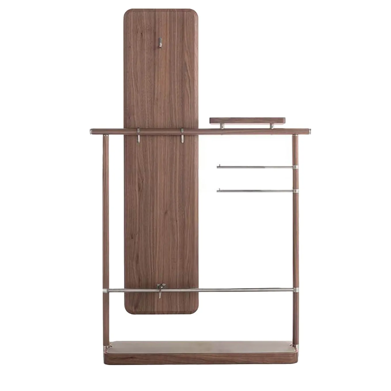 Giuseppe Bavuso’s valet stand epitomizes the fusion of design and practicality. Crafted from Canaletto walnut veneered aluminum tubing and satin steel garment bars, it exudes modern sophistication. With a walnut tray featuring a hide insert, an adjustable mirror, and a satin steel hanger, every detail is meticulously selected for elegance and functionality. The base, in walnut wood with hide insert options in coffee color, adds a touch of opulence to any space.