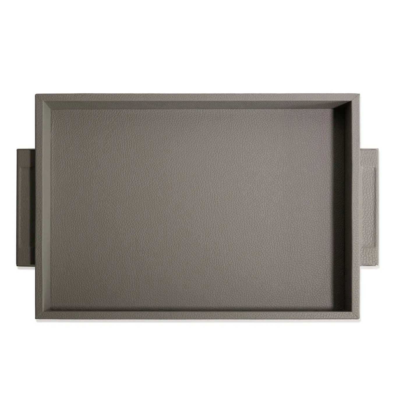This tray features fine genuine grain leather upholstery in a Luna Gray tone. Constructed with attention to detail, it includes sturdy metal handles for easy transport. The medium size offers versatile functionality, suitable for serving or organizing tabletop essentials. Available in fourteen color options to complement various interior settings; contact the concierge for more details.