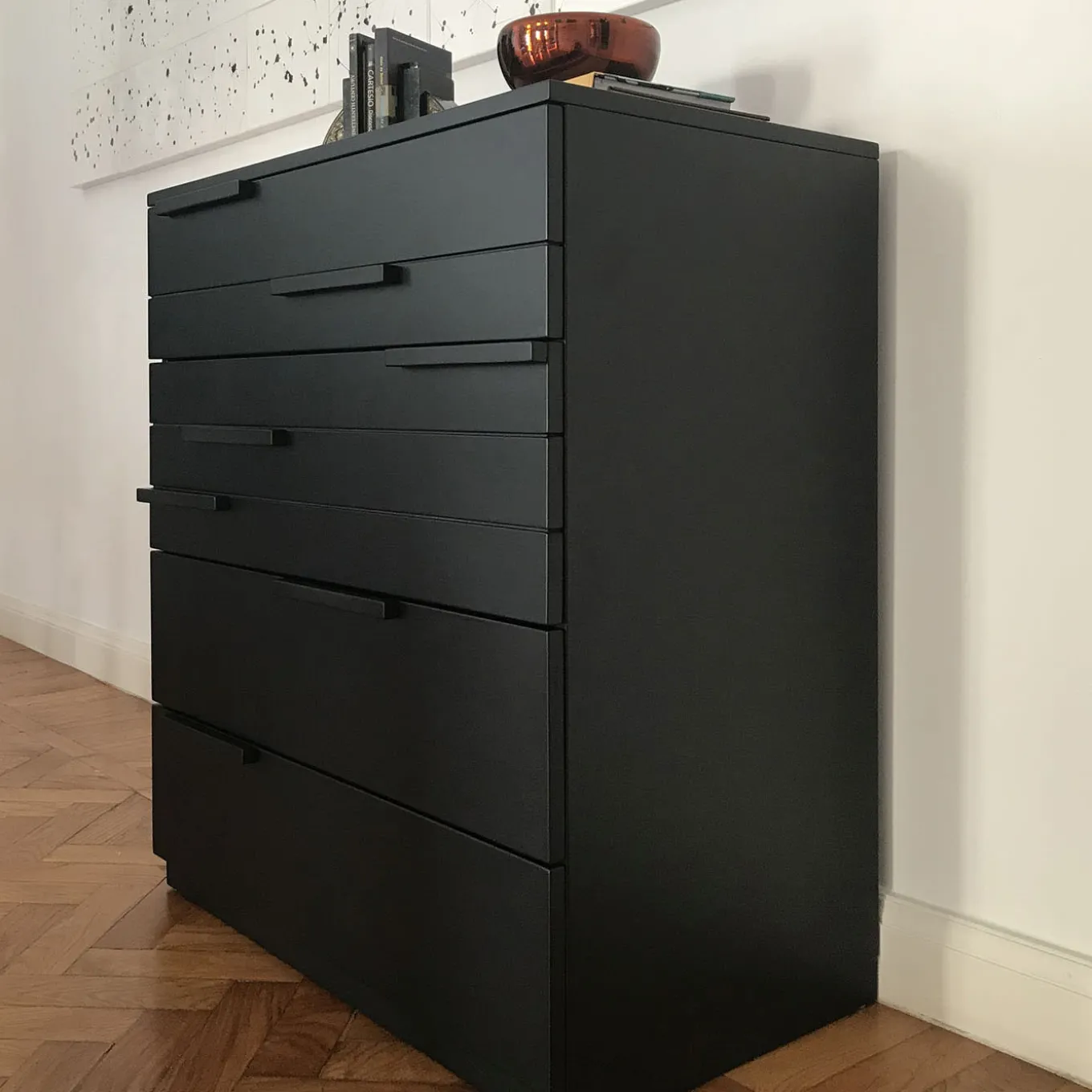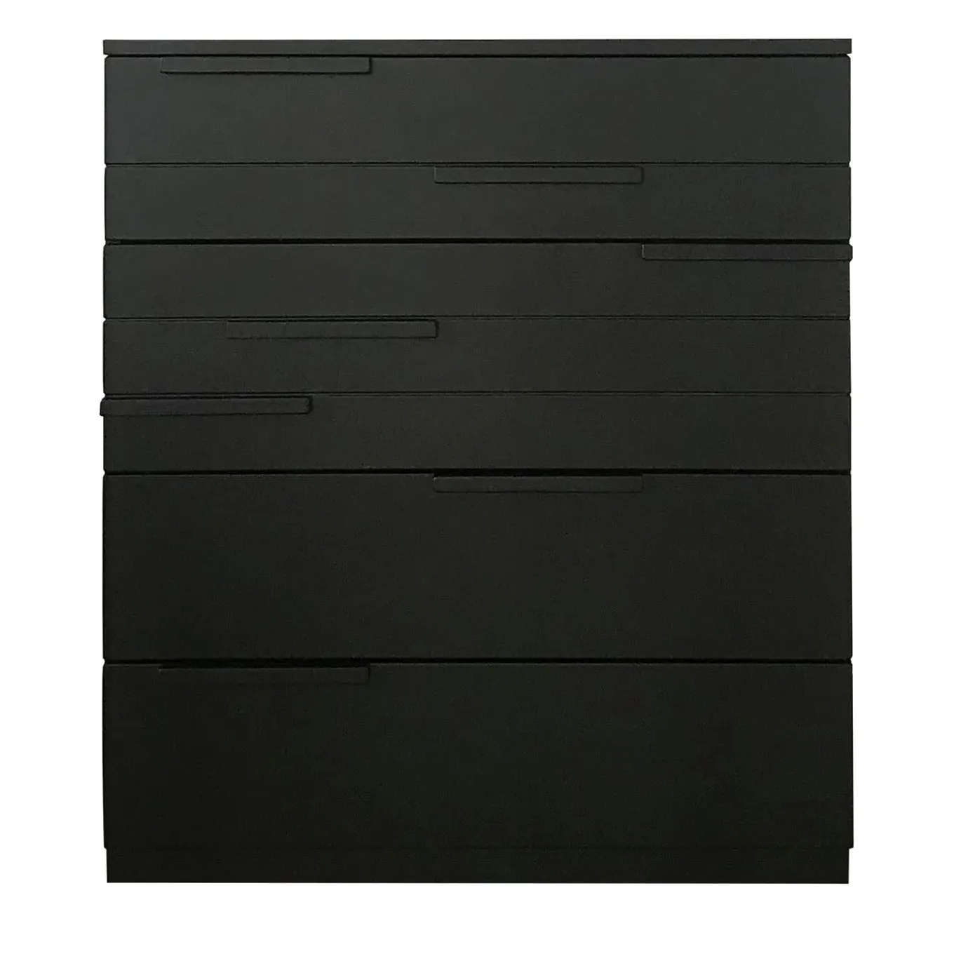 An exquisite accent to contemporary interior decors, this chest of drawers is reminiscent of a natural element, deftly crafted of wood and lacquered in a matte black shade. It features five drawers with different heights (9,5cm, 12cm, 22,5cm, 22,5cm, 22,5cm), customizable in measures and color upon request. Please consult the Concierge for further information.