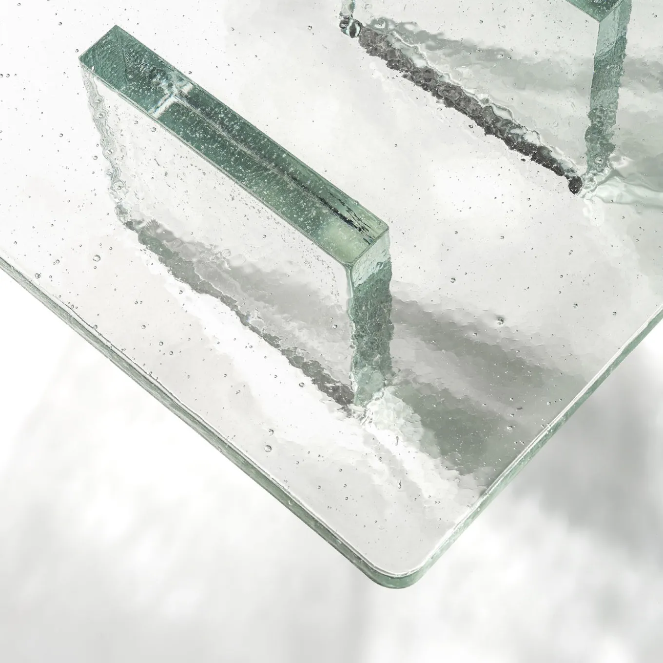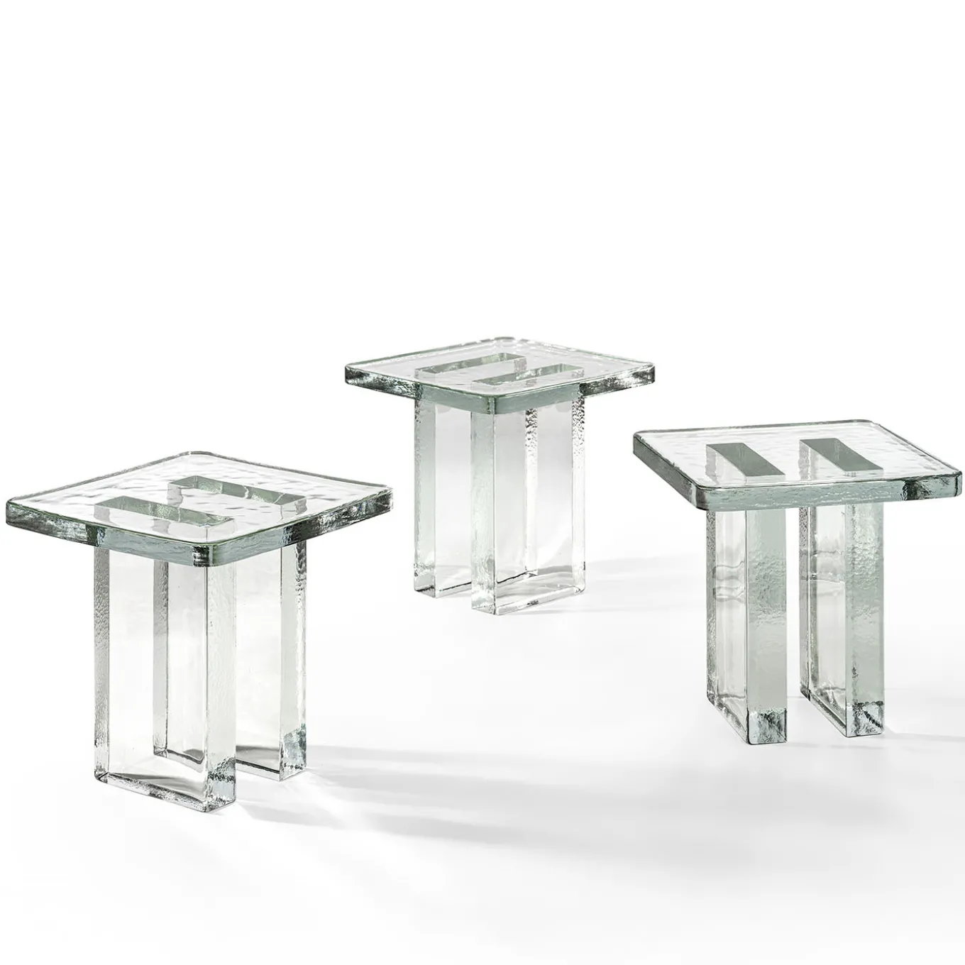 The Berg square glass side table by John Pawson features a striking design defined by the unique visual and tactile qualities of cast glass. Its sturdy, transparent structure explores the intersection between concrete form and abstract expression, presenting a medium-sized piece that merges art with functionality. The table’s solid yet fluid appearance makes it a compelling addition to contemporary living spaces.