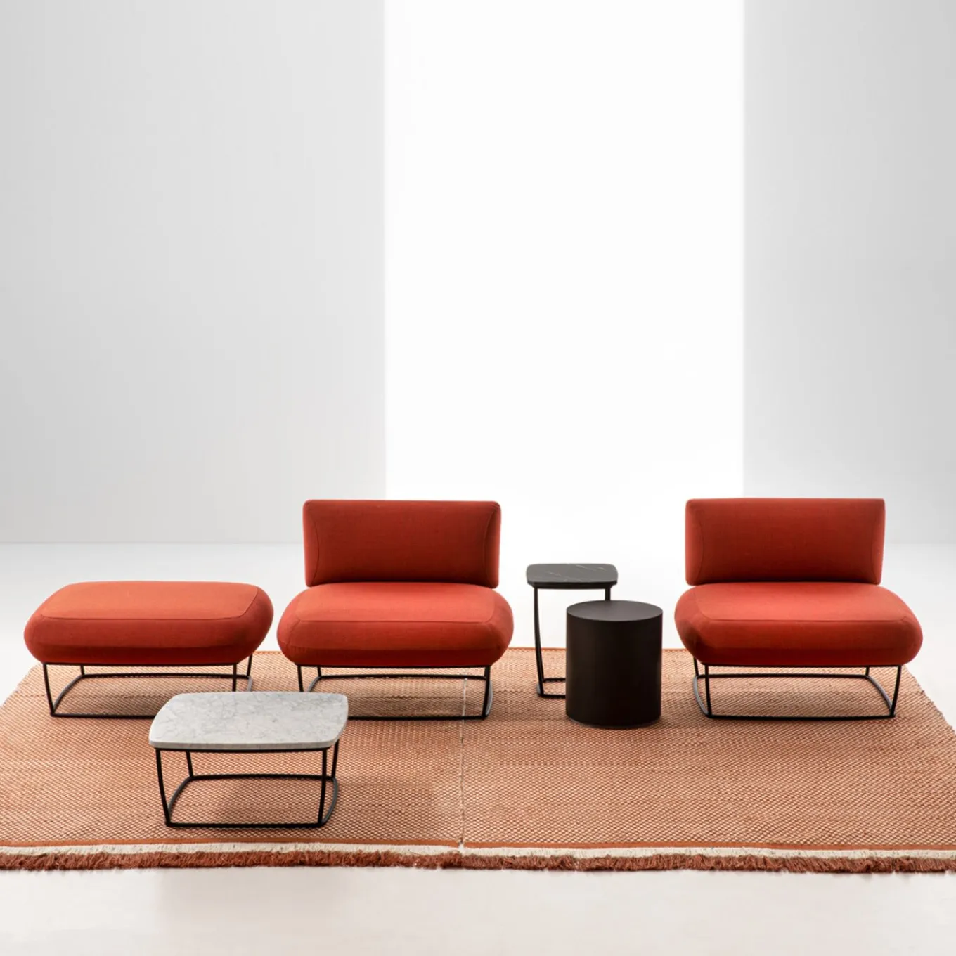 Bernard is a complete and versatile collection, suitable in both residential and contract. The original core is represented by a sophisticated small armchair, which stands out for the double seat direction, obtained thanks to the design of identical modules for the backrest and armrest, which can freely vary their function. Orange new wool worsted upholstery complements the pitch black base. Other finished are available, please ask Concierge for details.