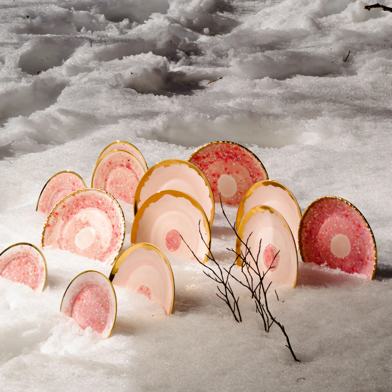 Serve up your culinary masterpieces on a platter worthy of an art museum. This large serving plate features an abstract, organic surface in dappled, deep raspberry surrounding an almost embryonic inner circle of light pink, evoking the birth of life and ultimate creation. Bordered by elegant, gold craquelure trim.