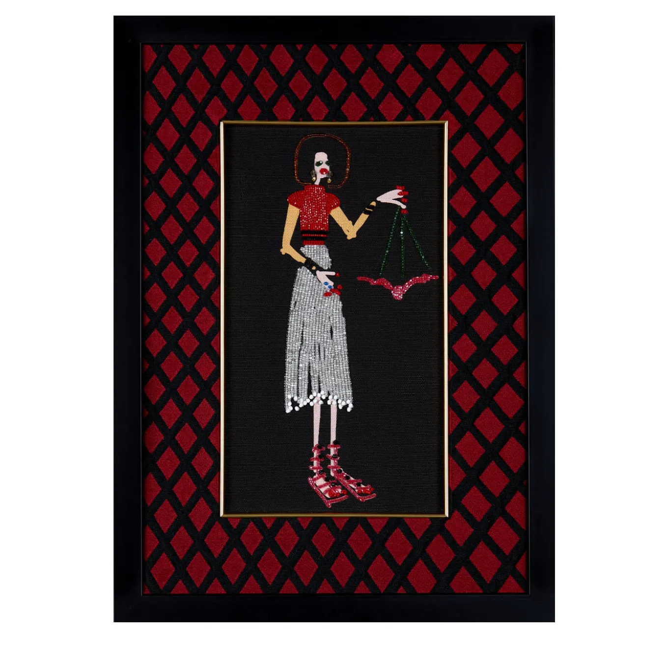 Surrounded by a hypnotizing red-and-black diamond pattern, a graceful female figure embroidered with meticulous care is the subject of this textile artwork. The printed linen base is enriched with jais and cutdana glass beads that harmonize with minute embroideries – combining smoke-gray, red, pink, and pitch-black threads – tracing the woman’s silhouette.