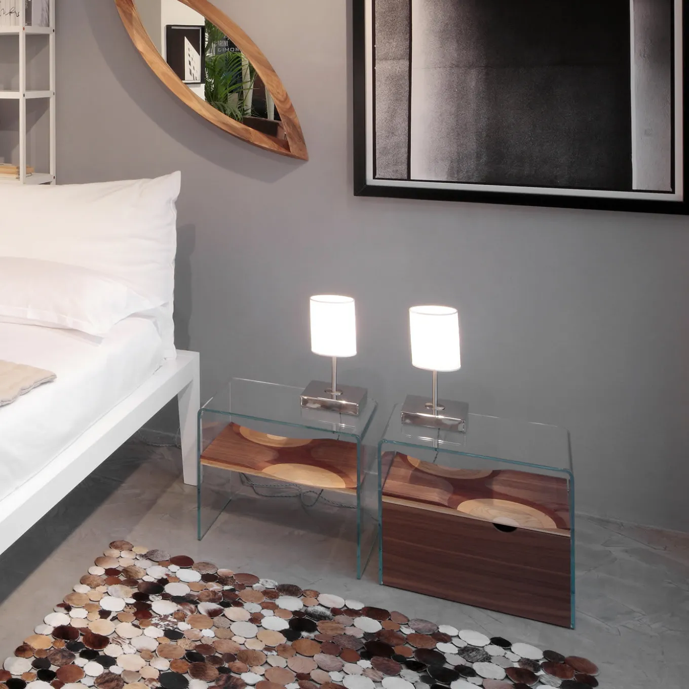 Exquisitely designed by Toyo Ito and part of the Ripples Collection, this nightstand features a shelf made of five different types of wood (walnut, cherry, mahogany, ash, and oak), enclosed in an extra clear tempered glass frame, creating a “trompe l’oeil” effect of mid-air suspension. A capacious drawer on wheels made of MDF is at the bottom, boasting a white lacquered front and the opposite one in walnut veneer.