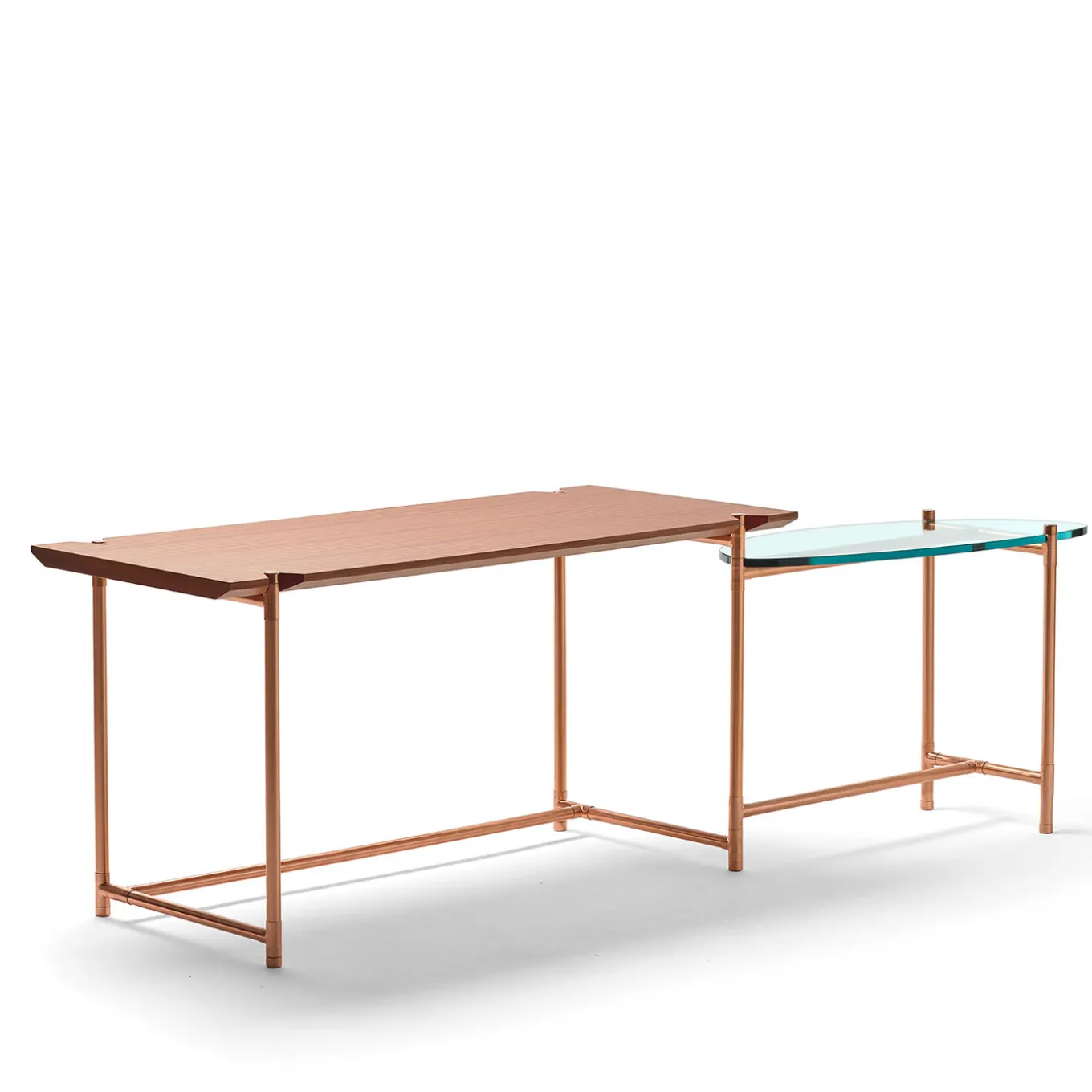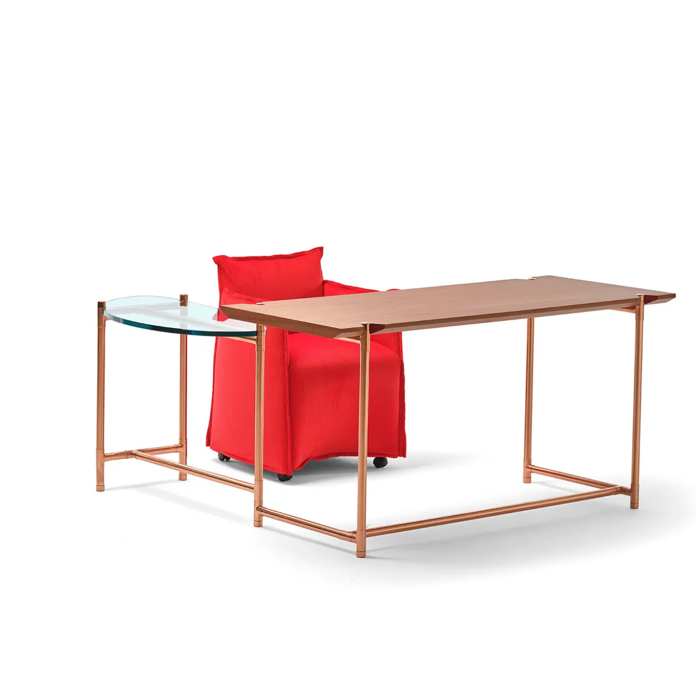 Blending lightweight and prized materials, this sleek desk will accent any modern office or study with subtle sophistication. The inner steel structure with external copper tubing supports a rectangular top in oak-veneered, medium-density fibreboard which is kept in place with the help of four, red-finished cut-outs. The same system serves as the support for the extra, rotating surface in 1.5cm-thick, float glass flaunting an ellipsoidal silhouette.