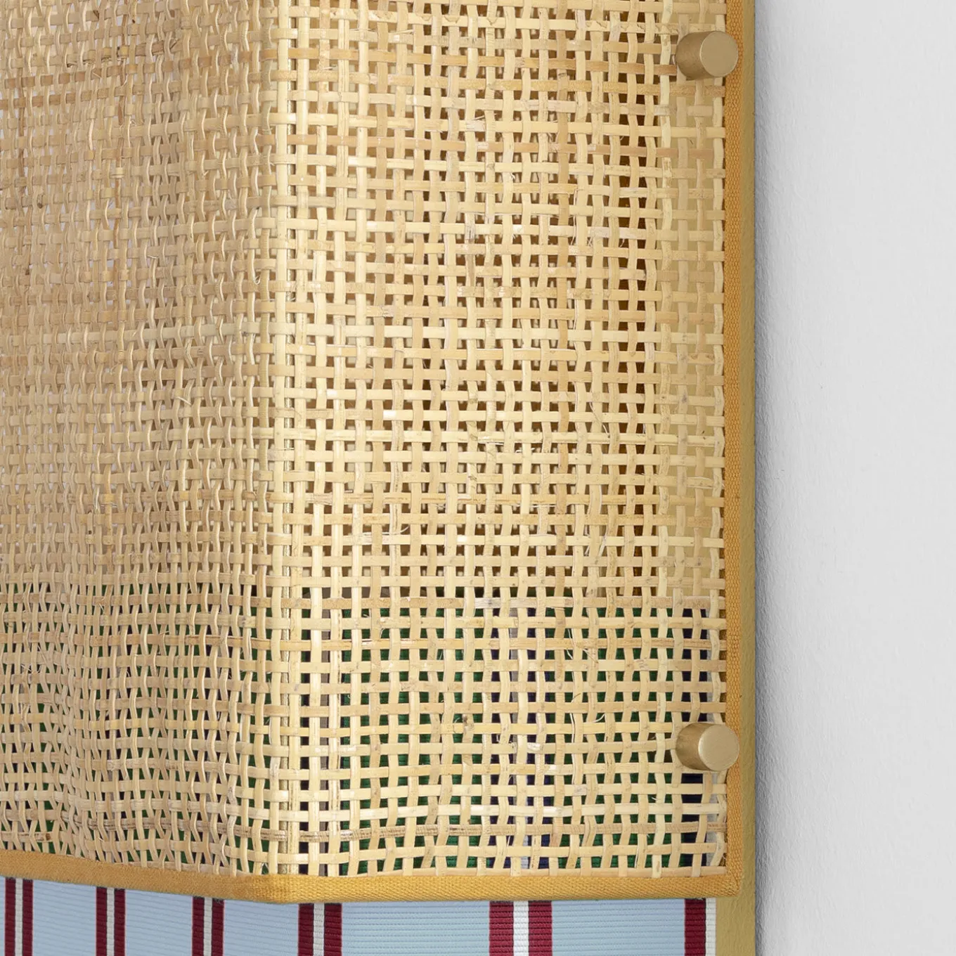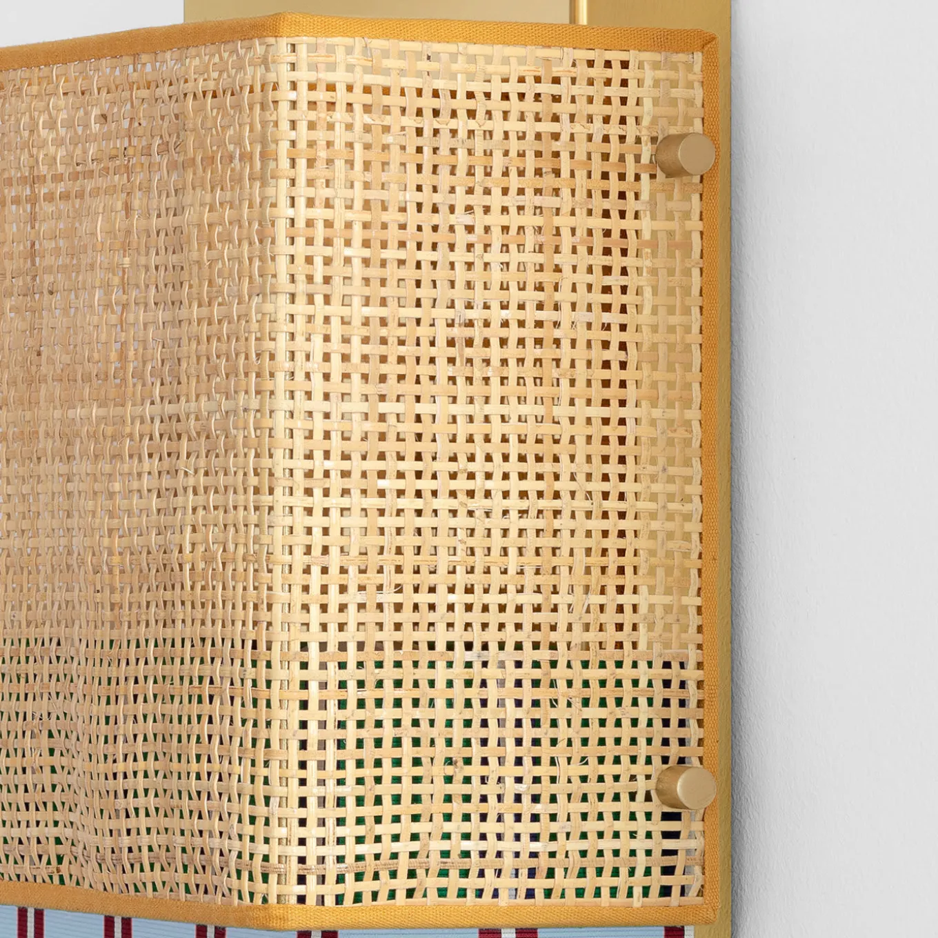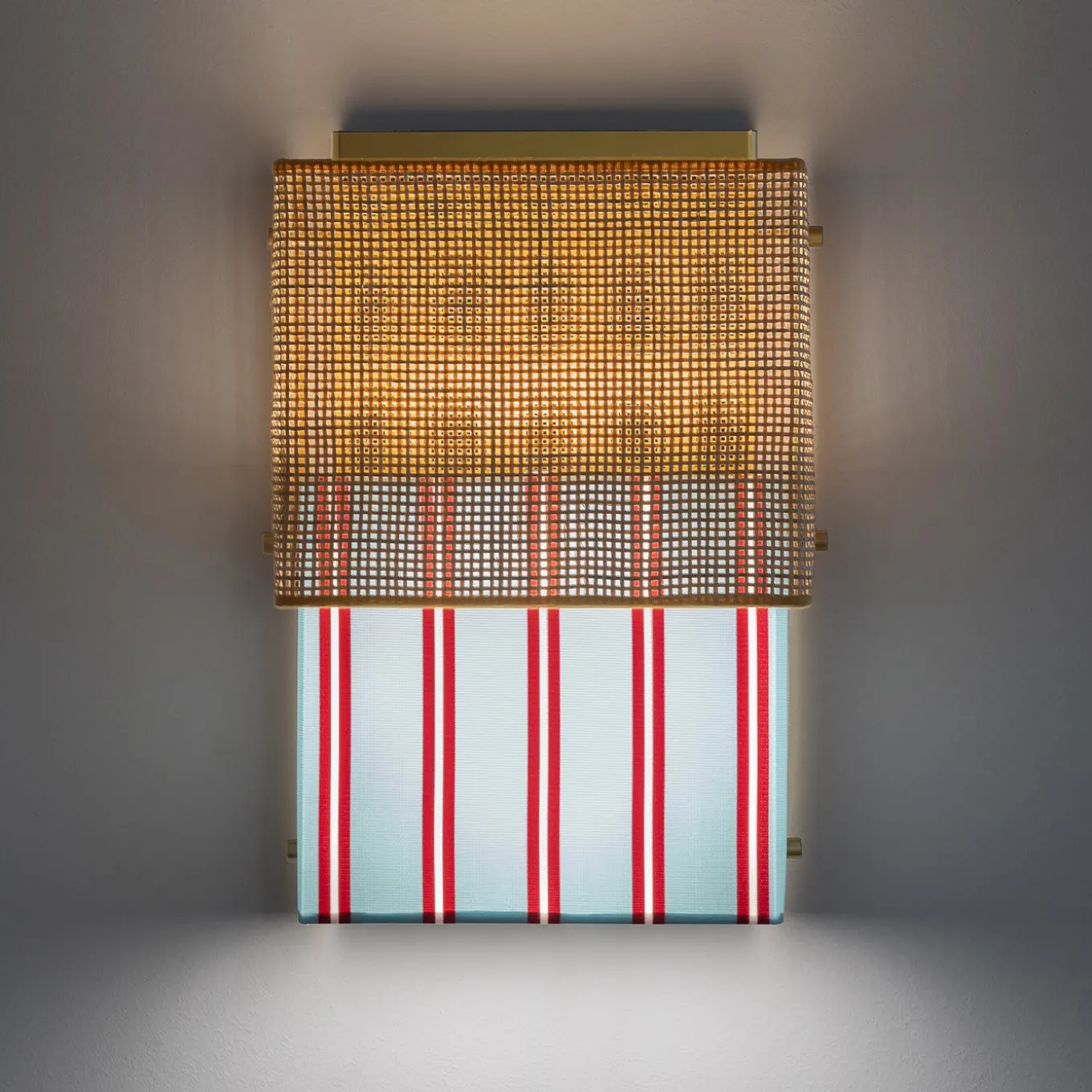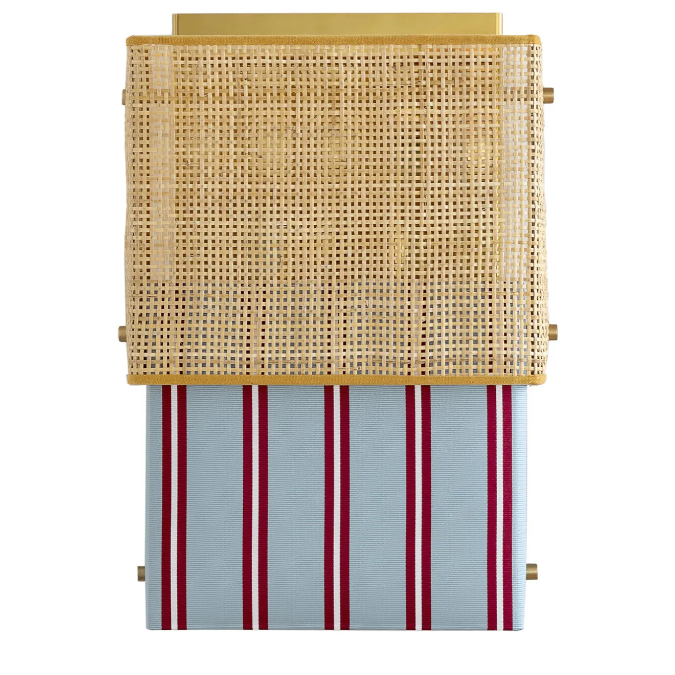 This elegant, whimsical wall lamp is made from a surprising combination of contrasting textures and textiles. A rough rattan surface sits above smooth Trevira fabric in light-blue, red and white stripes. This two-piece design was inspired by the iconic bikini swimsuit. A lustrous, gold-plated structure diffuses and reflects the light.