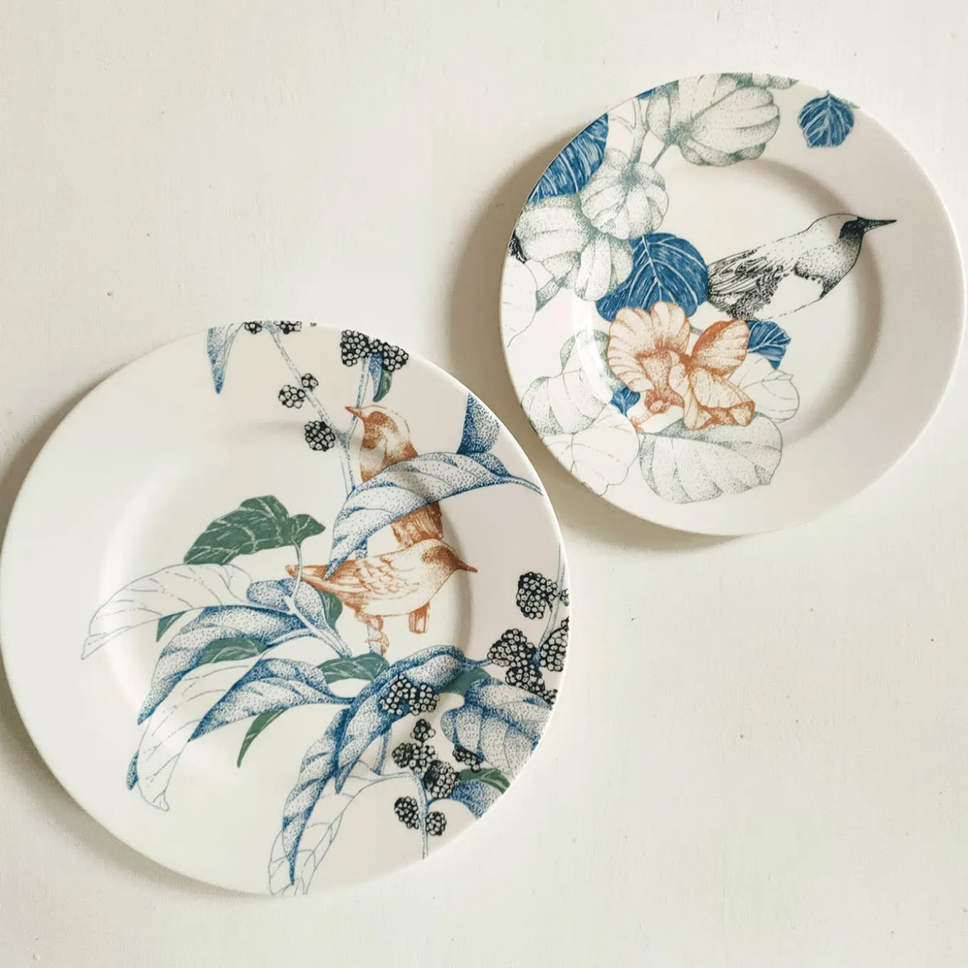 A poetic glimpse of a bird trying to hide in the midst of foliage is impressed on this set of bread plates composing this fine porcelain set. Both oven- and dishwasher-safe, the plates flaunt a sophisticated chromatic palette where green, terracotta, and blue shades enhance the decoration’s minute details initially obtained with the pointillism technique. A set of coordinated napkins are also available.