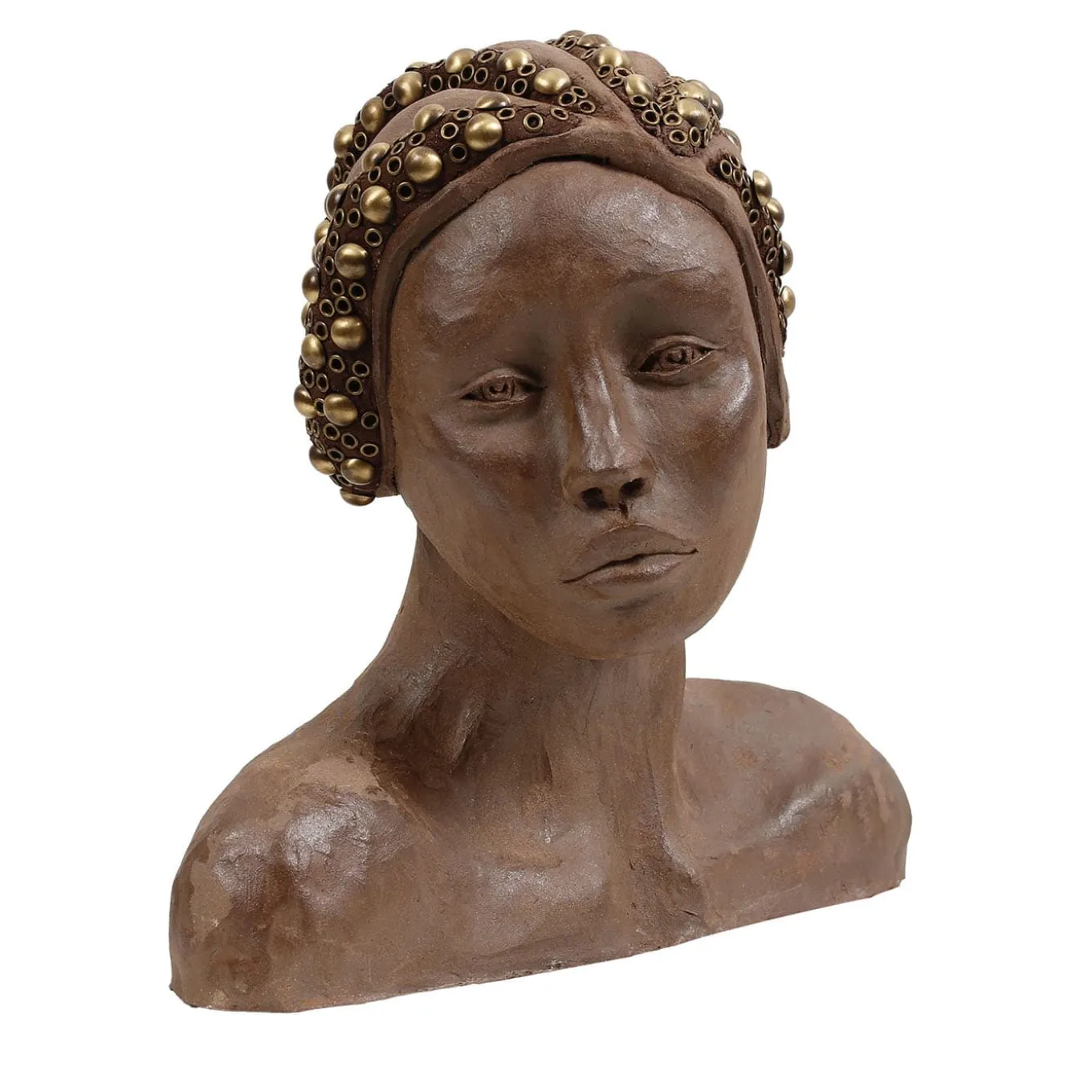 This piece celebrates the essence of a legendary Viking warrior, paying homage to the powerful and enigmatic female commander from Birka and capturing the spirit of a figure who defied the norms of her era. The headpiece, adorned with brass studs, symbolizes strength and authority, reminiscent of the funerary garb associated with her legacy. Crafted in high-quality stoneware, this sculpture exhibits a robust presence, making it a striking focal point in any space. It invites a reflection on history and the powerful narratives that shaped it.