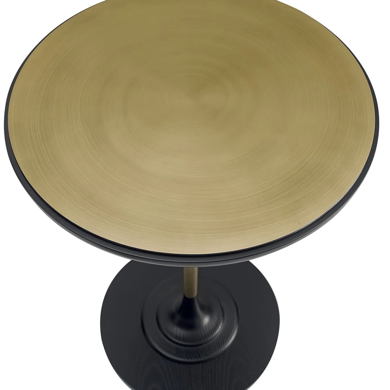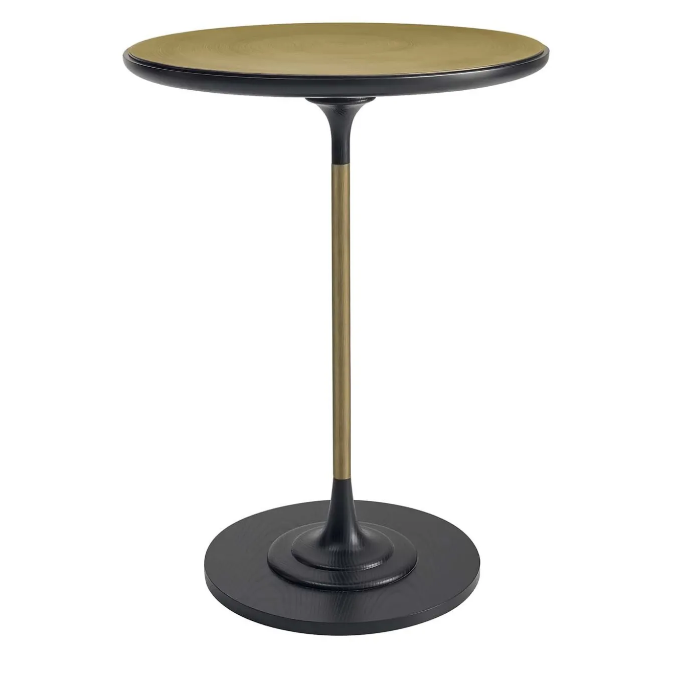 A unique piece of minimalist elegance, this striking side table will elevate the look of both a private home or office decor. Its slim yet sturdy structure is made of plywood and ash-veneered MDF, with parts in black-lacquered solid ash wood. The round top is fashioned of burnished brass, adding a shiny look to the piece.